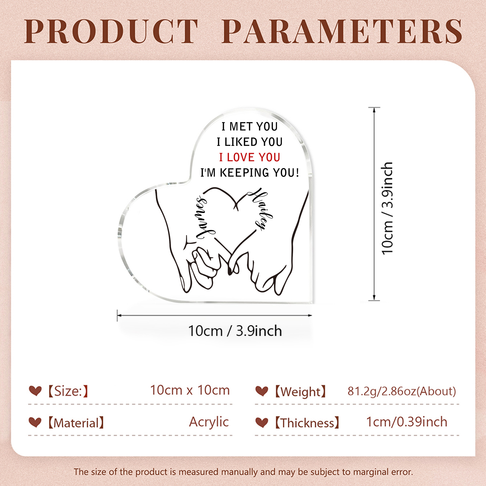 • Crafted from premium acrylic material, ensure the texture and shine of the keepsake endure, becoming a cherished and lasting gift. The product is made of sturdy, transparent acrylic that stands up well on flat surfaces.