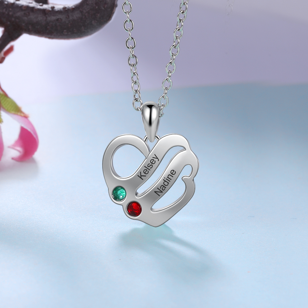 Personalized Heart Pendant Necklace with 2 Birthstones Family Necklace