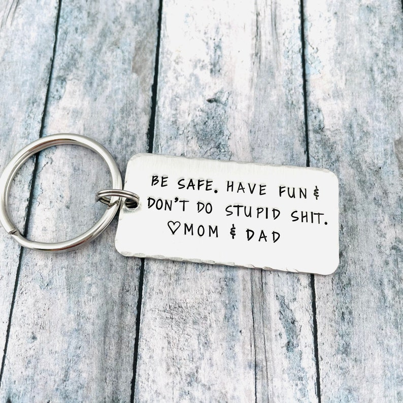 The keychain engraved with "Be safe. Have fun. Don't Do Stupid Shit" is the funny gift idea for your kids for their Birthday, Graduation, Anniversary, Christmas, Thanksgiving, etc! This keychain will be with them side by side, wherever they go so they can feel that you are always there for them. It is useful and practical but also is able to convey the meaning of your love.
