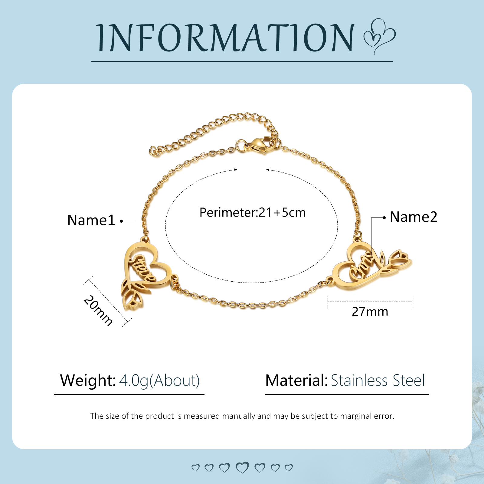 Personalized Heart Bracelet Custom 2 Names Rose Flower Bracelet For Her