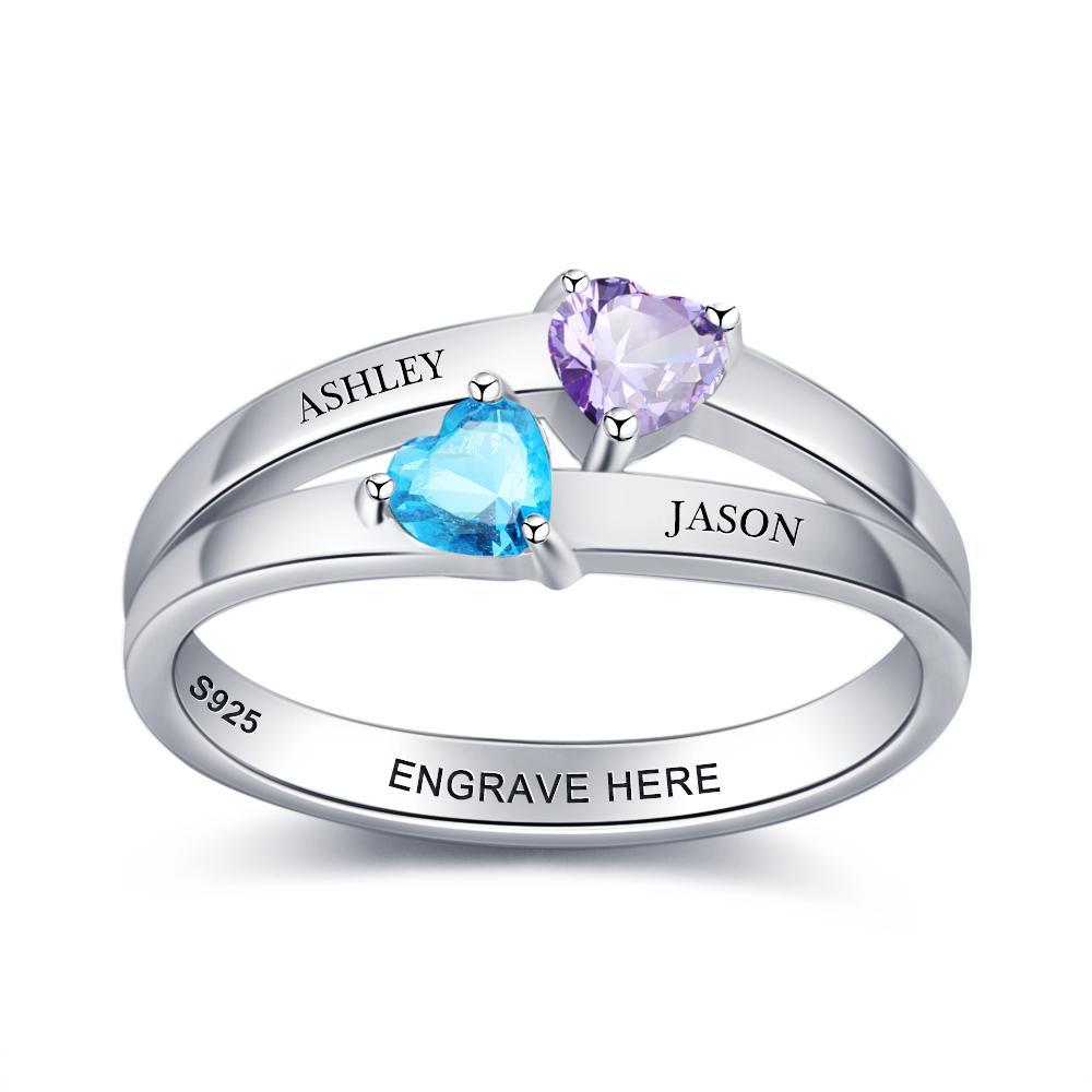 Mother Ring with 2 Heart Birthstones Engraved 2 Names Promise Ring Personalized Couple Ring
