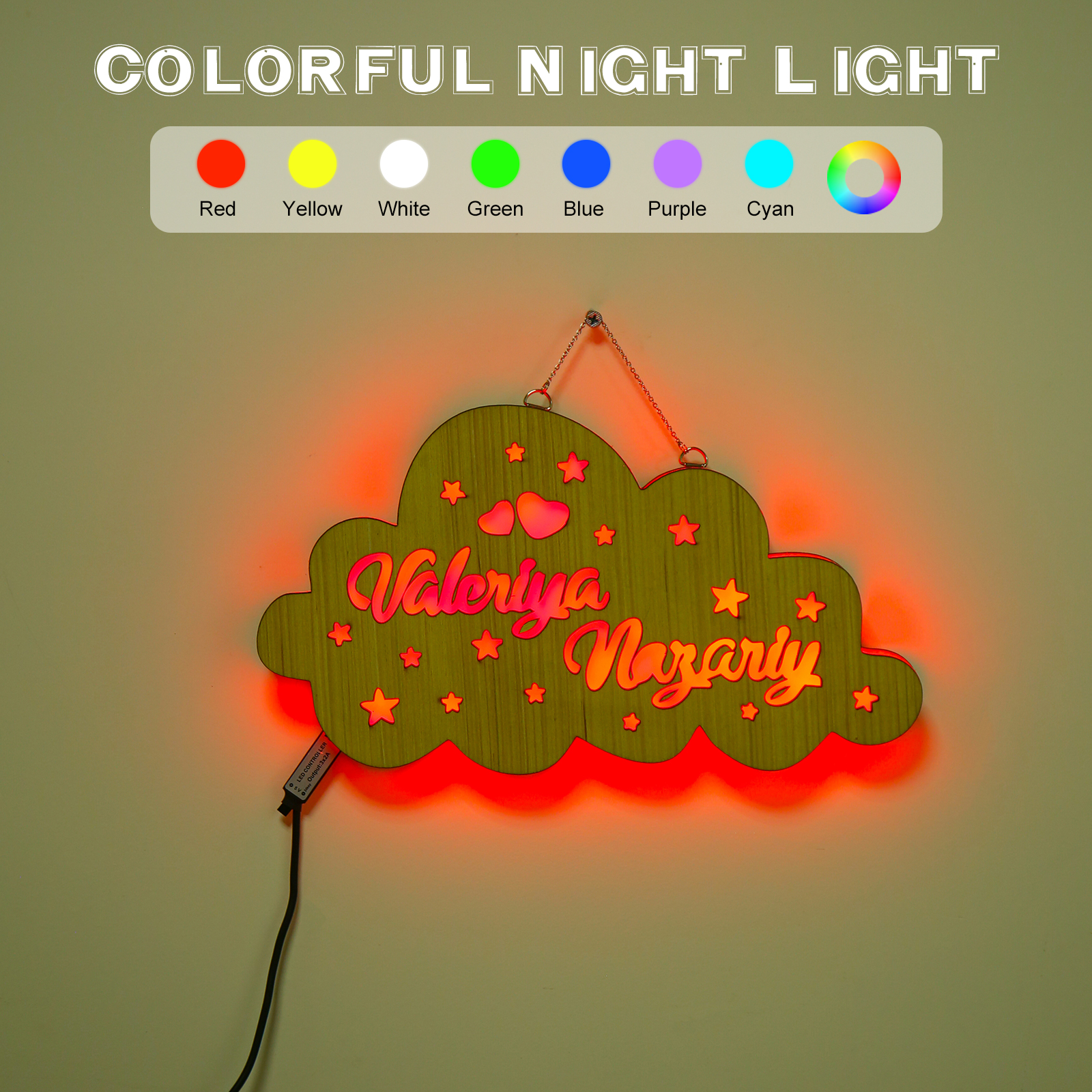 Personalized Cloud Wooden Night Light Custom 2 Names LED Lamp
