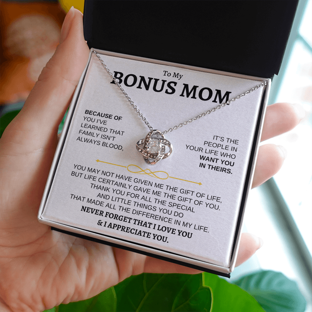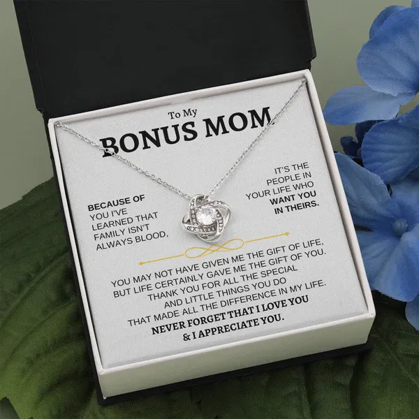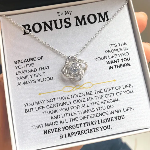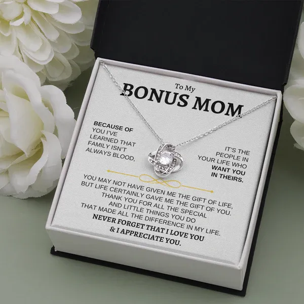 To My Bonus Mom Love Knot Necklace Gift Set" NEVER FORGET THAT I LOVE YOU"