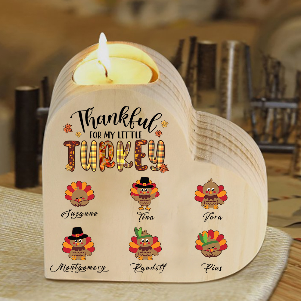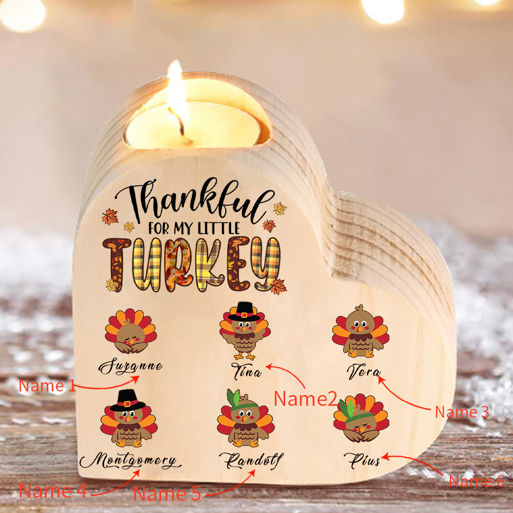 6 Names - Thanksgiving Wooden Candle Holder Customized Name Candlestick "Thankful For My Little Turkey" Thanksgiving Gift for Family