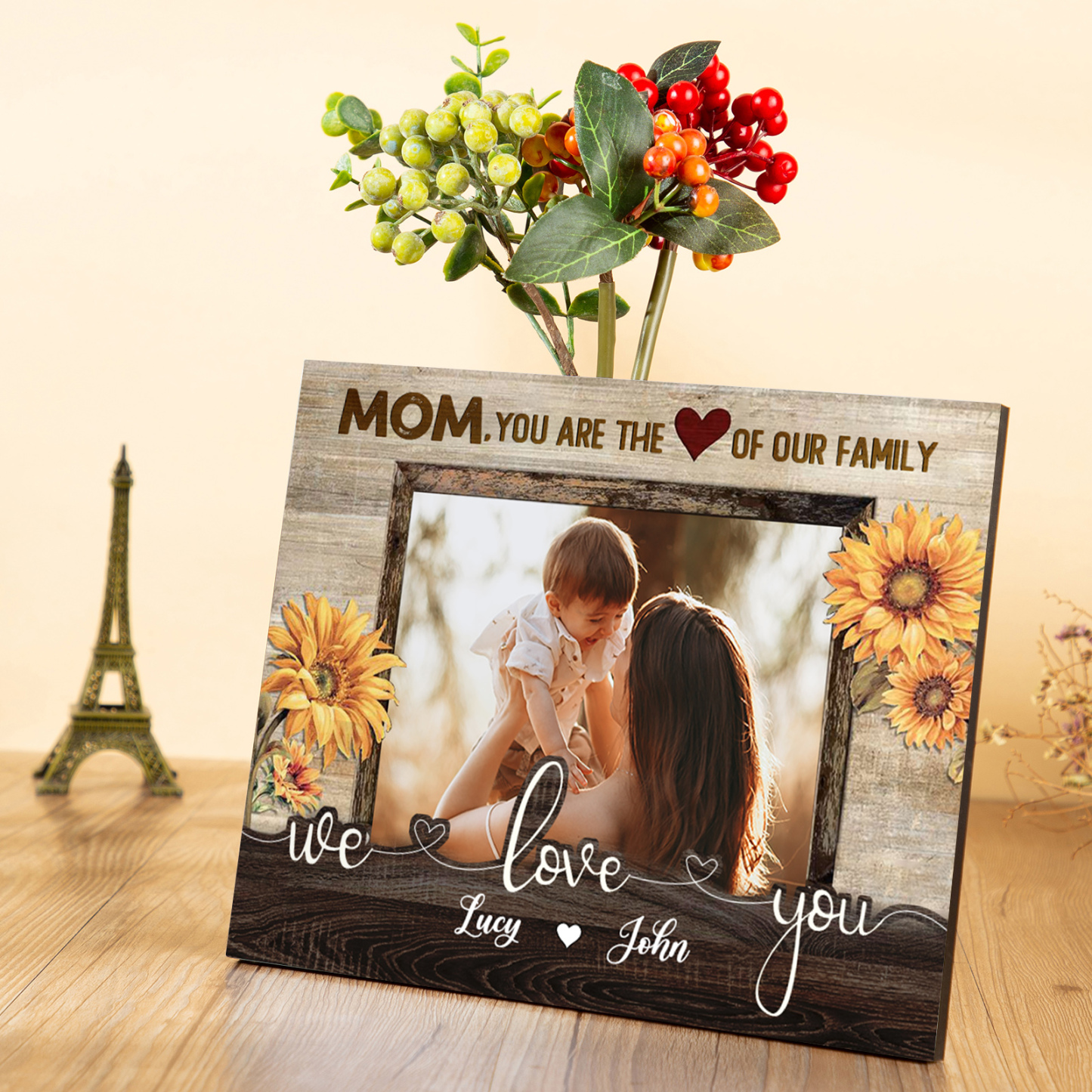 Personalized 2 Names & 1 Photo Wooden Plaque Custom Sunflower Home Decor Gifts for Mom - You Are The Heart/Love Of Our Family