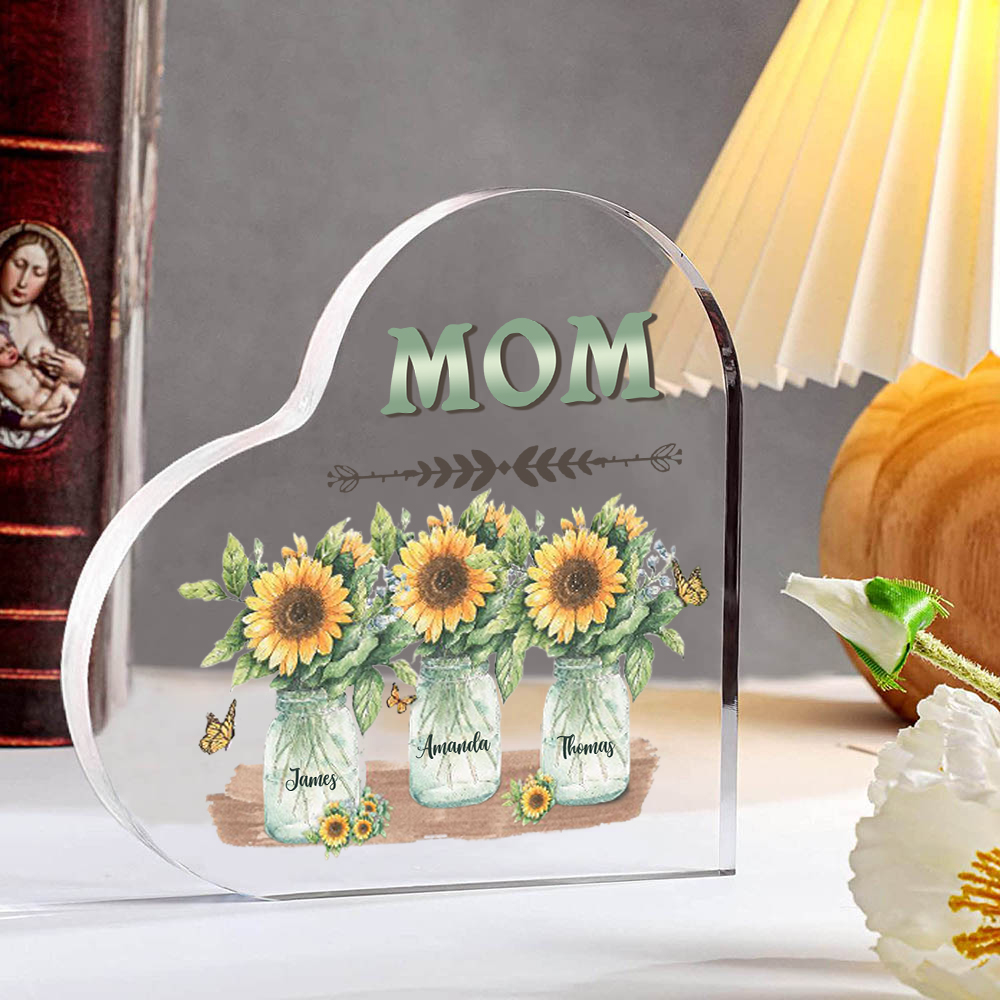 Personalized Acrylic Heart Keepsake Custom 3 Names & 1 Text Sunflower Vase Ornament Gifts for Mother/Grandma