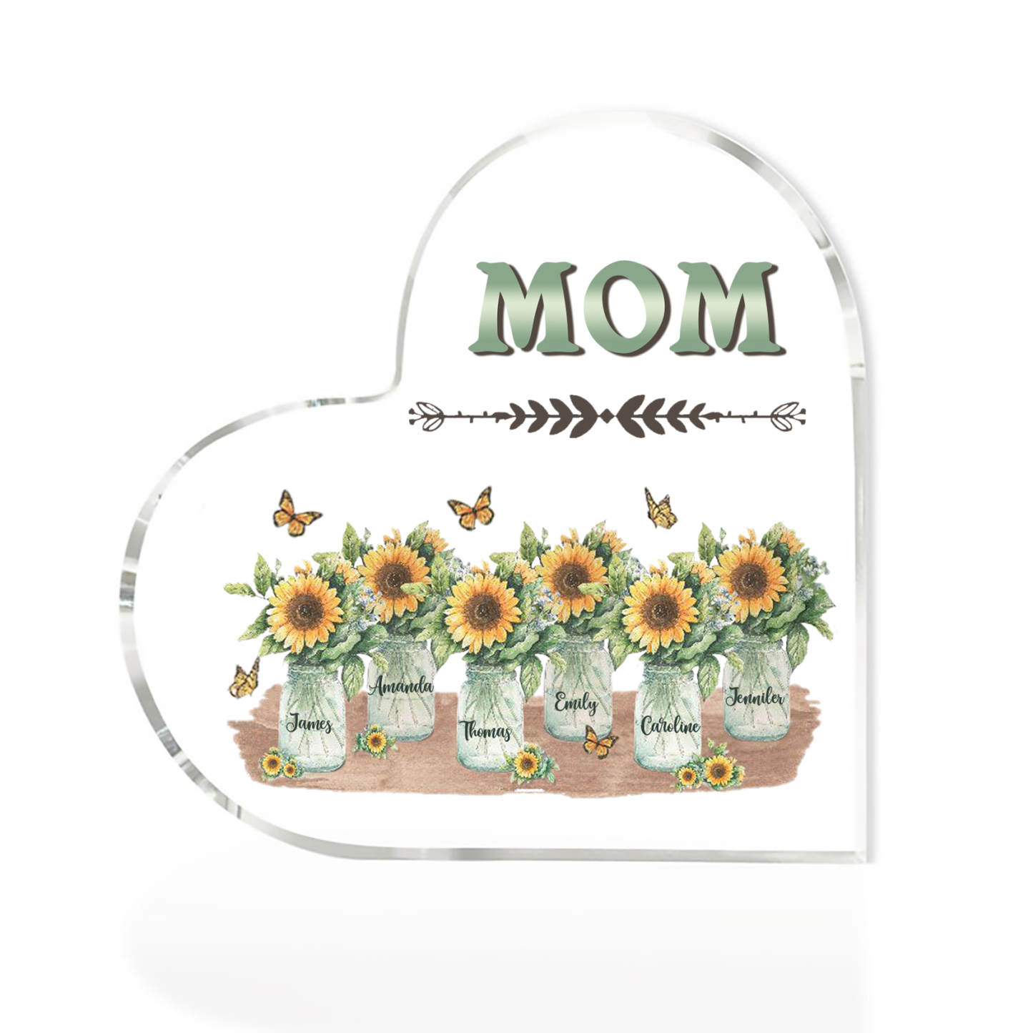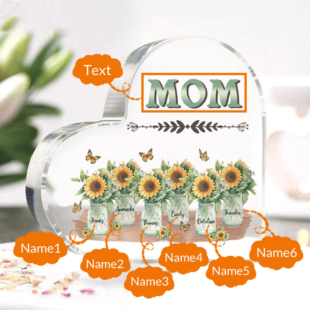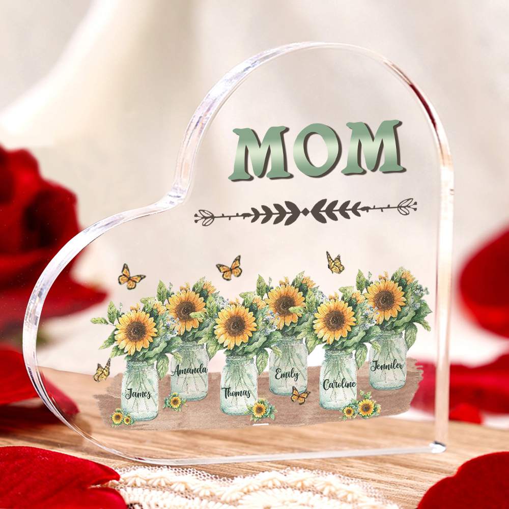 Personalized Acrylic Heart Keepsake Custom 6 Names & 1 Text Sunflower Vase Ornament Gifts for Mother/Grandma