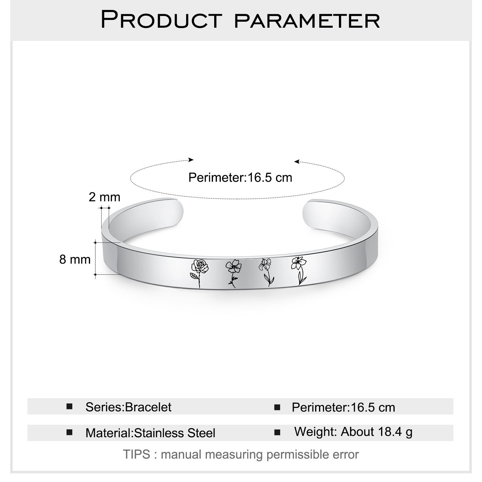 • Can engrave 4 birth flowers on the bangle.
