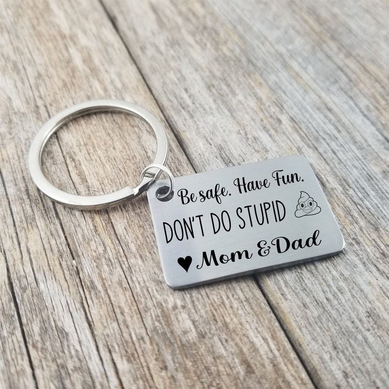 The keychain engraved with "Be safe. Have fun. Don't Do Stupid. ❤ MOM & DAD" is the funny gift idea for your kids for their Birthday, Graduation, Anniversary, Christmas, Thanksgiving, etc! This keychain will be with them side by side, wherever they go so they can feel that you are always there for them. It is useful and practical but also is able to convey the meaning of your love.