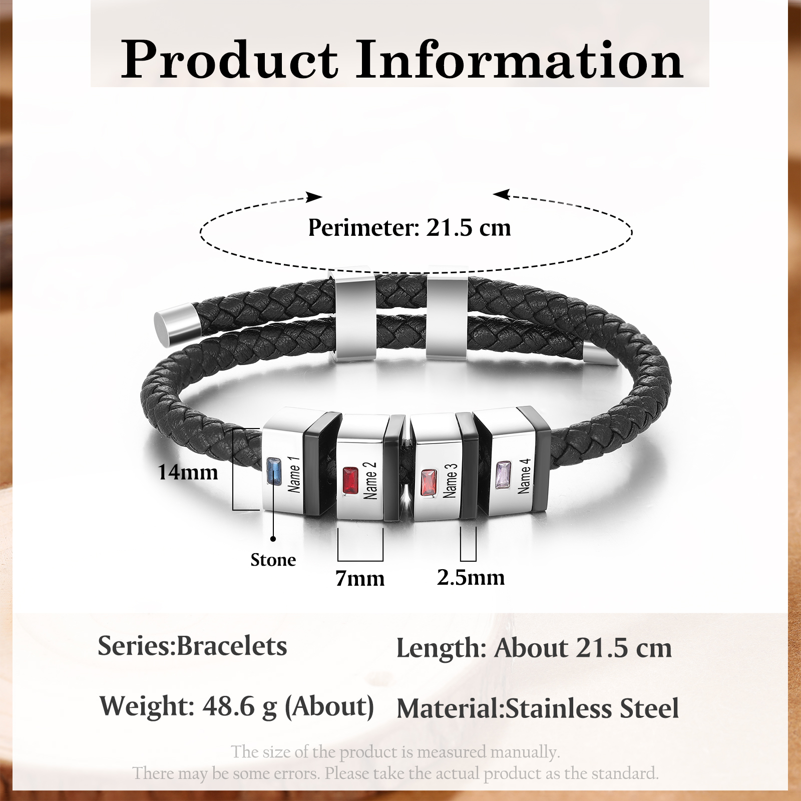 Custom Men Braided Leather Bracelet Engrave 4 Names Beaded Wrap Bracelet For Father's Day