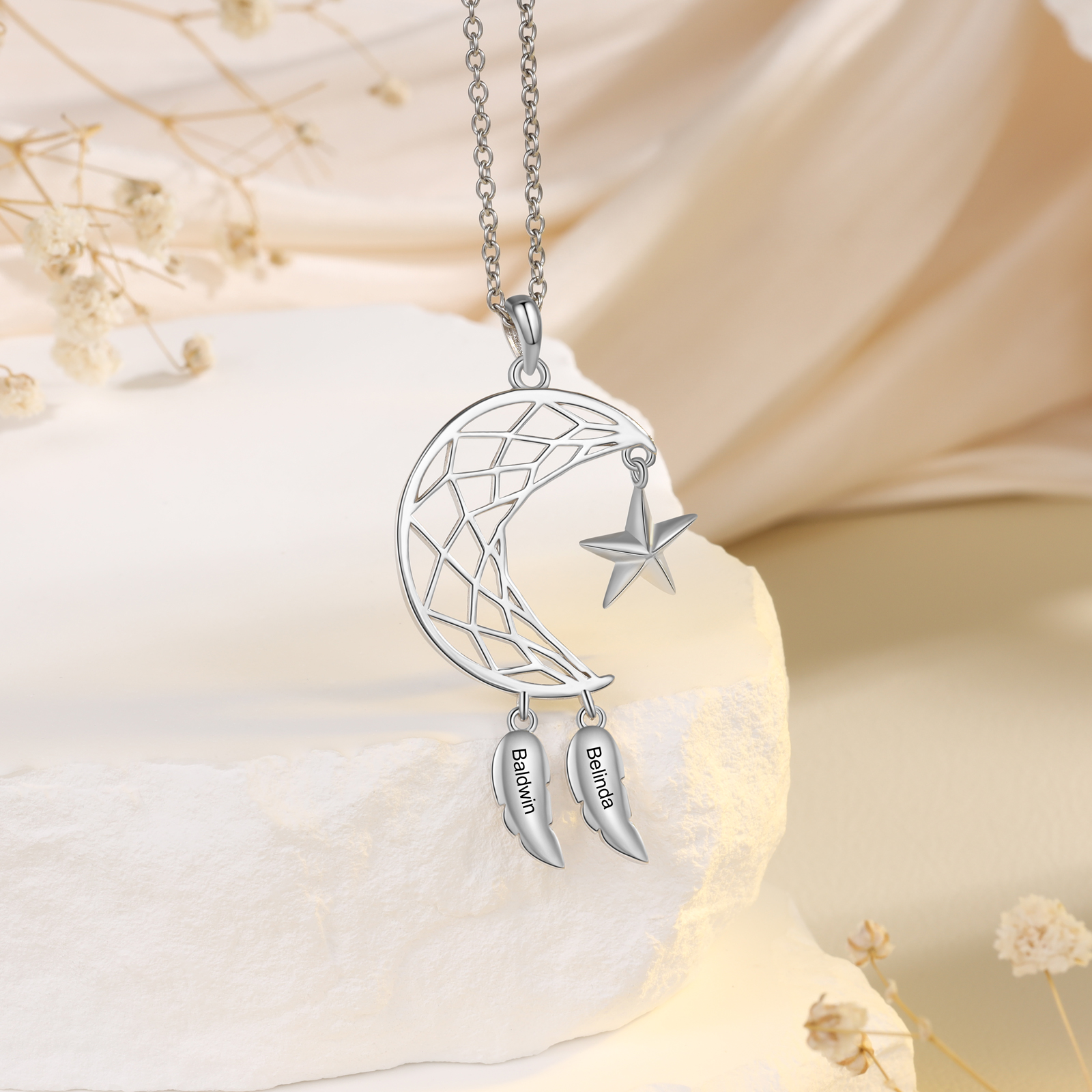 Dream Catcher Necklace Custom 2 Names Moon and Star Necklace for Her