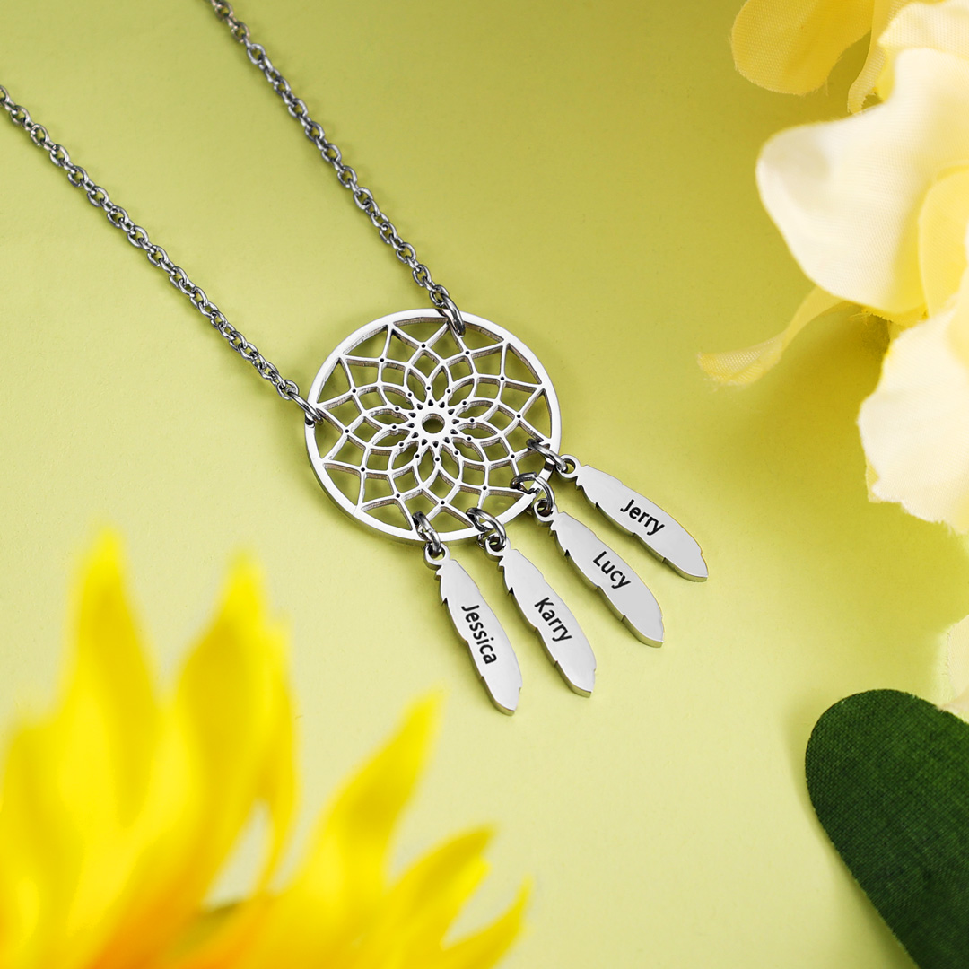 Personalized Dream Catcher Necklace with Engraving 4 Names for Women