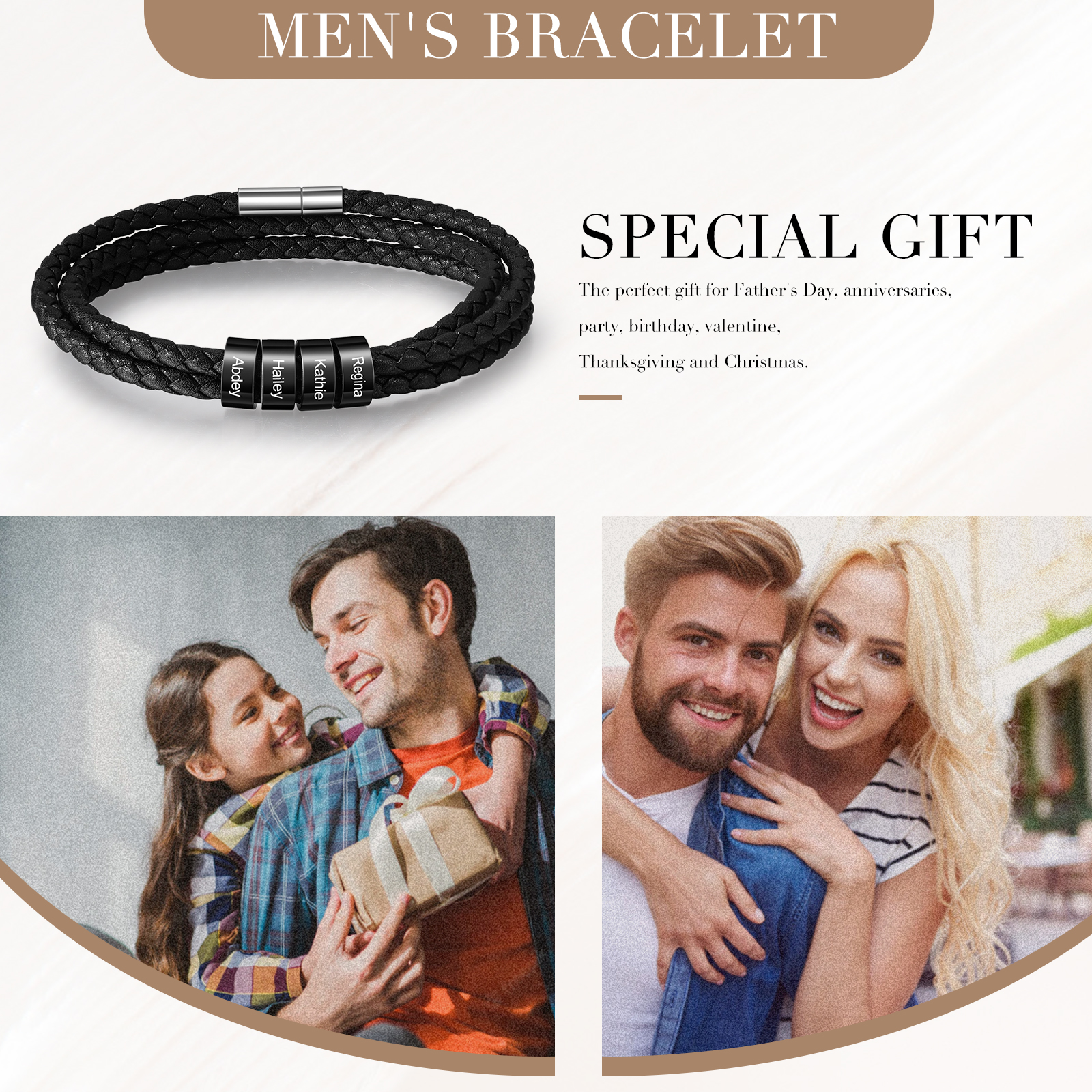Personalized Men's Leather Bracelet Custom 4 Names Braided Bracelet with Beads Multi-Layered Bracelet Gift for Dad
