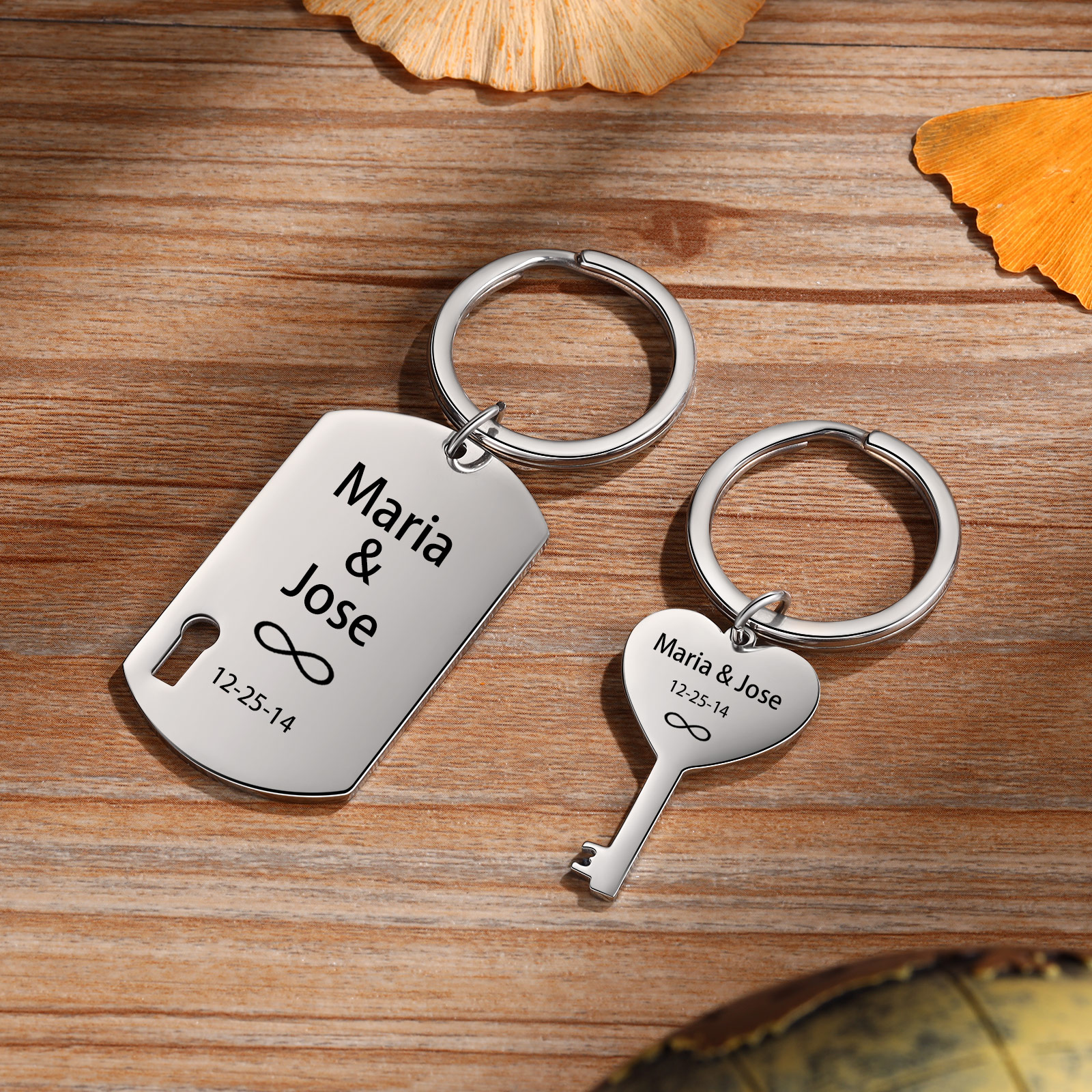 2 PCS Couple Keychain Set Custom 2 Names & Date Keyring Stainless Steel Keychain Valentine's Day Gift for Him/Her