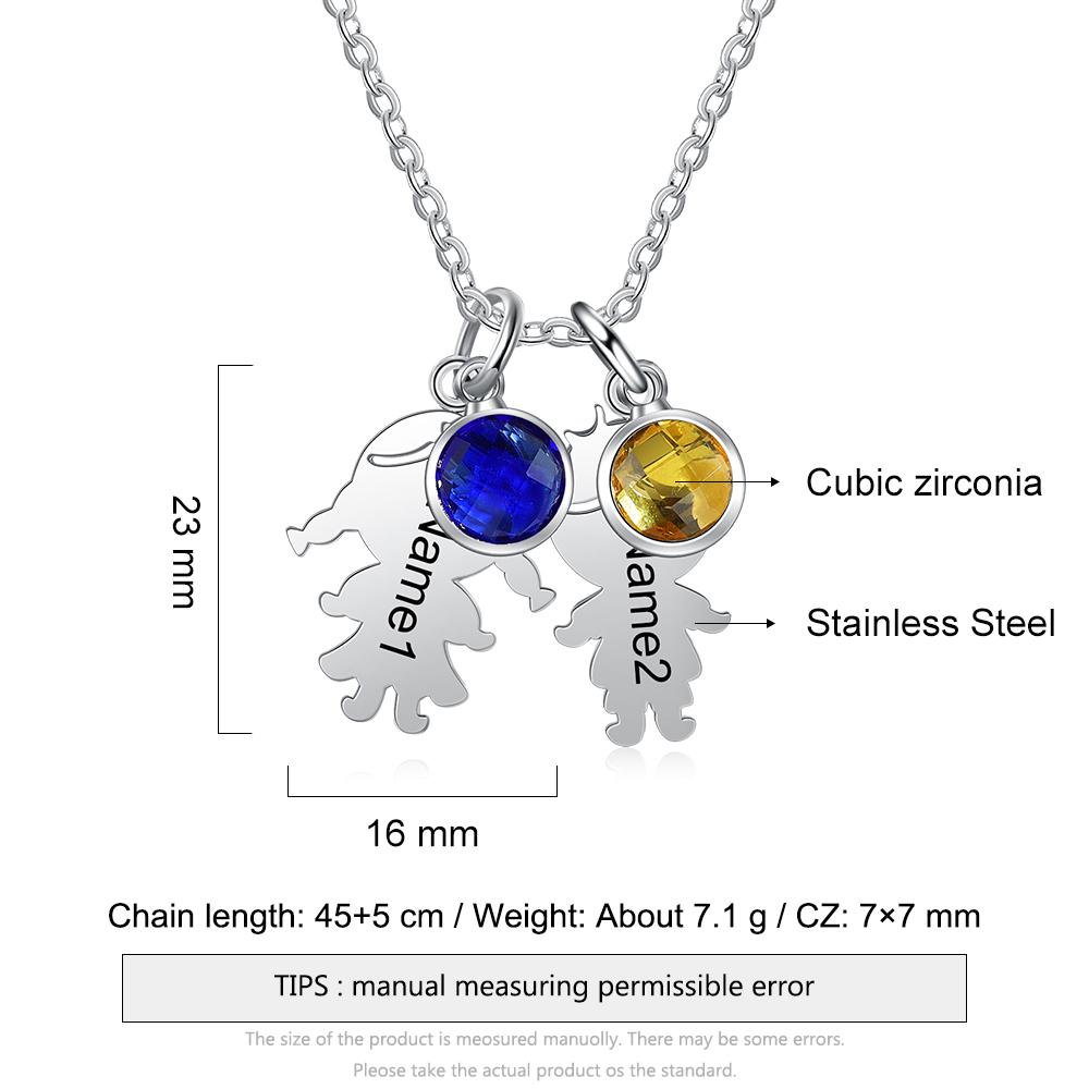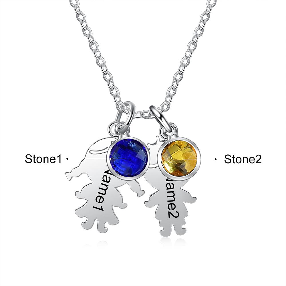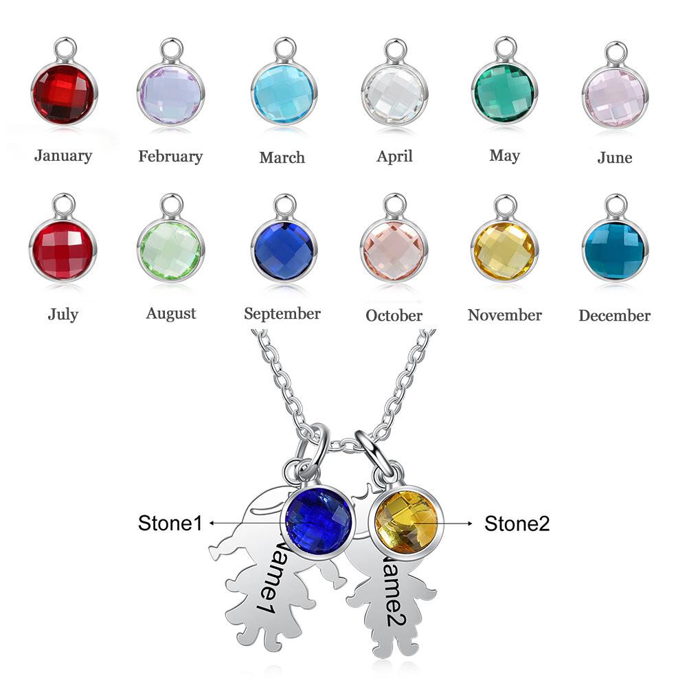 Birthstone Mother Necklace with Kid Charms and Engraved 2 Names