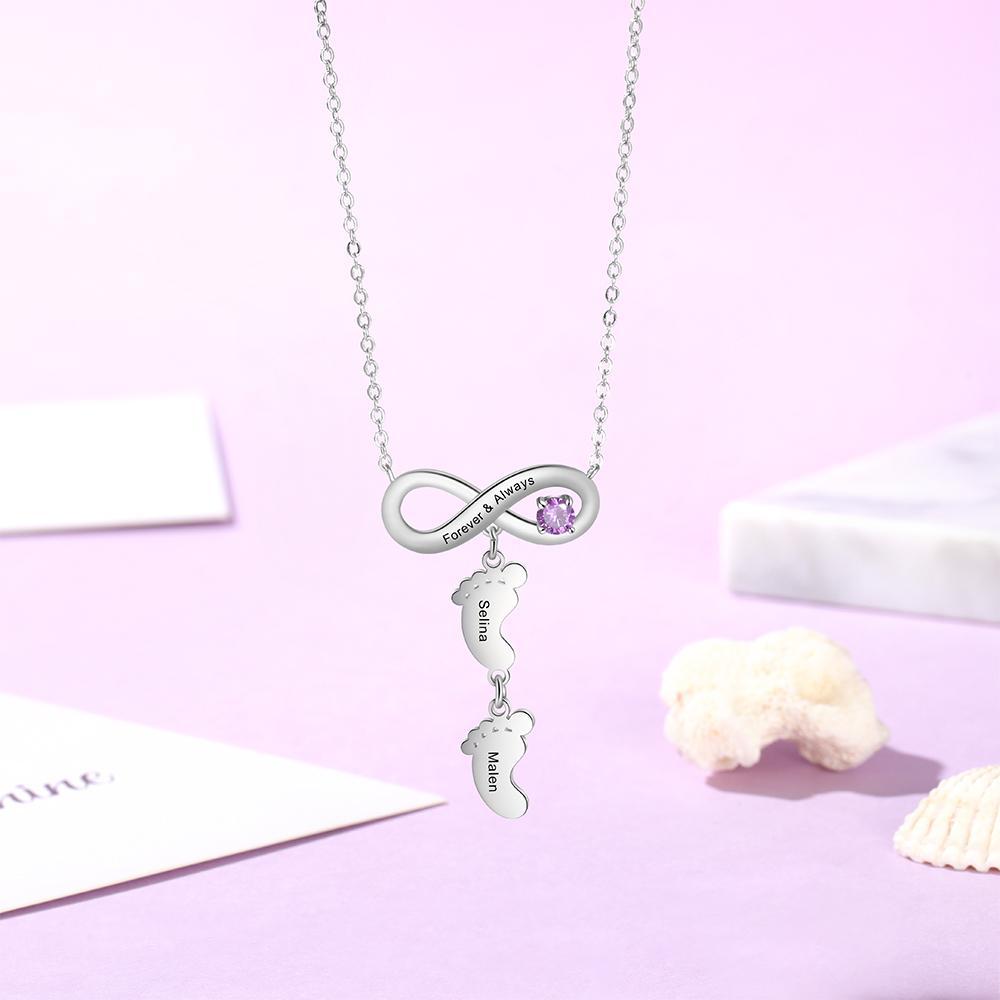 Infinity Baby Feet Necklace Mother Necklace with 2 Kid's Names and Birthstone