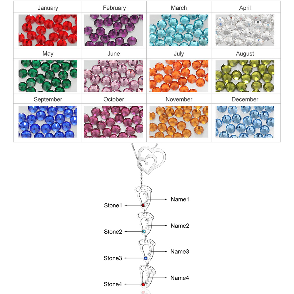 Personalized Heart Baby Feet Name Necklace Custom 4 Birthstones Family Necklace