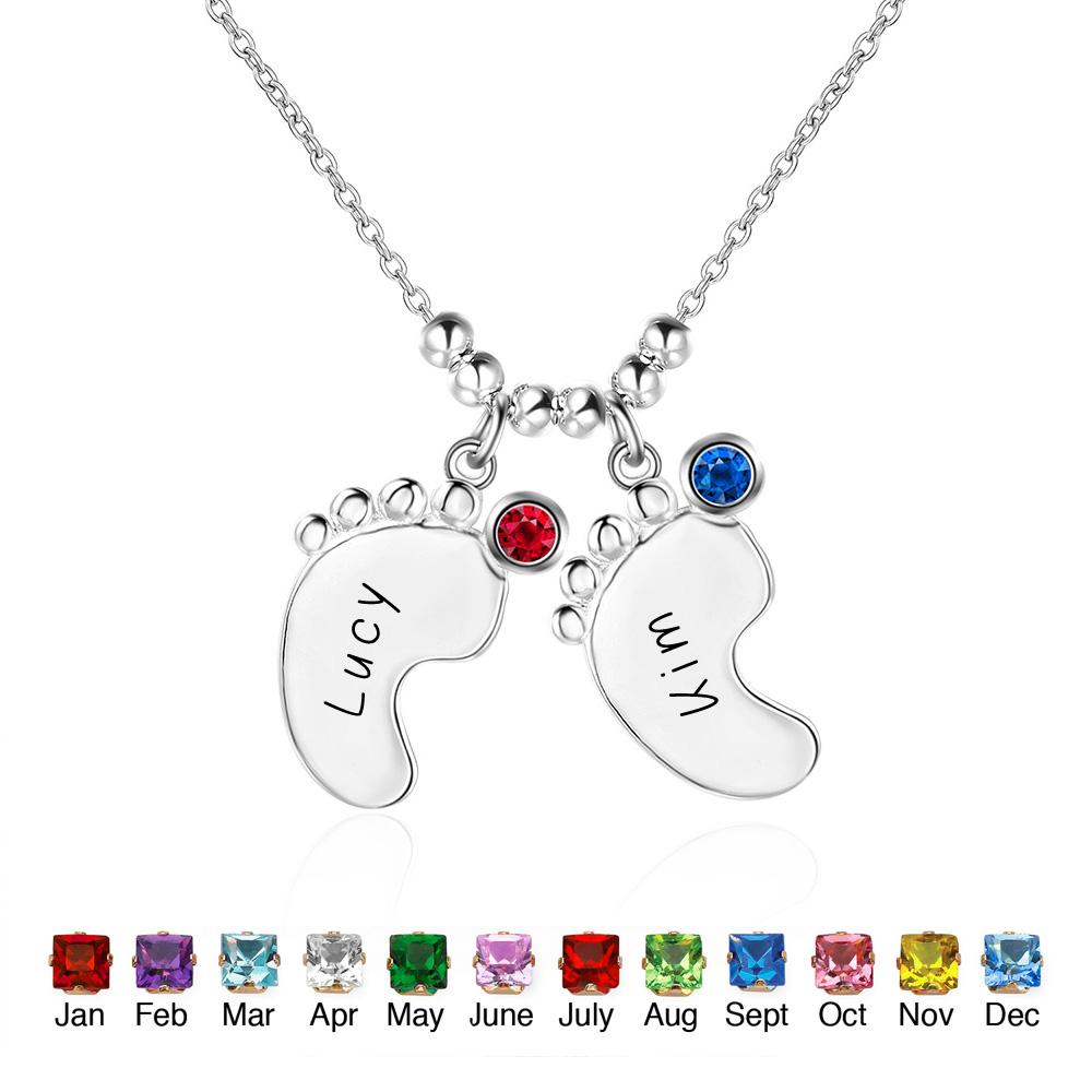 Baby Feet Necklace Mother Necklace with 2 Names and 2 Birthstones S925 sterling silver