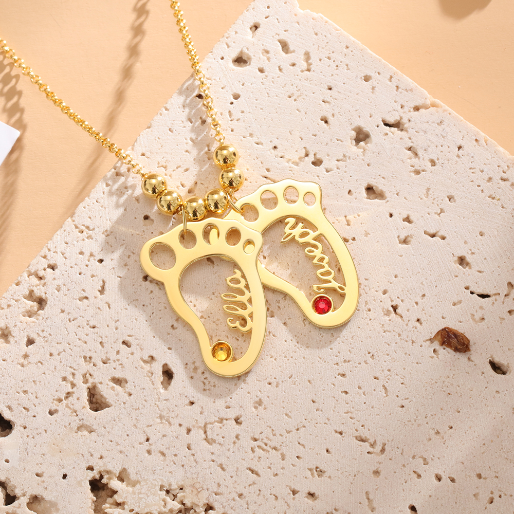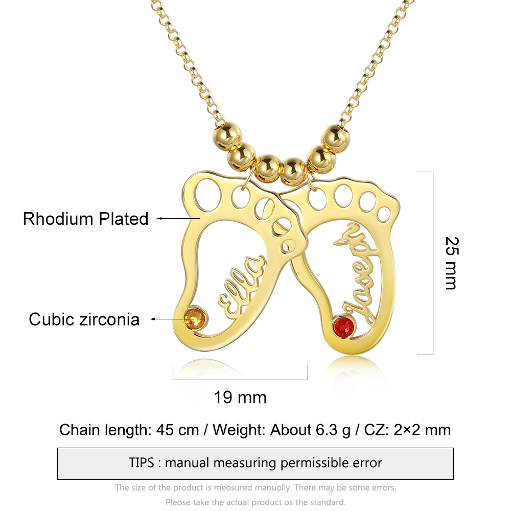 Baby Feet Name Necklace Hollow Feet Engraving 2 Names with Birthstones
