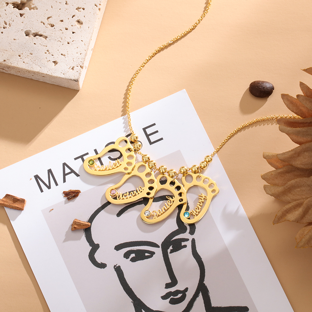 Baby Feet Name Necklace Hollow Feet Engraving 4 Names with Birthstones