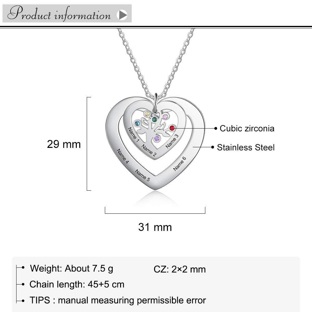 Personalized Heart Family Tree Necklace with 6 Birthstones Necklace for Her