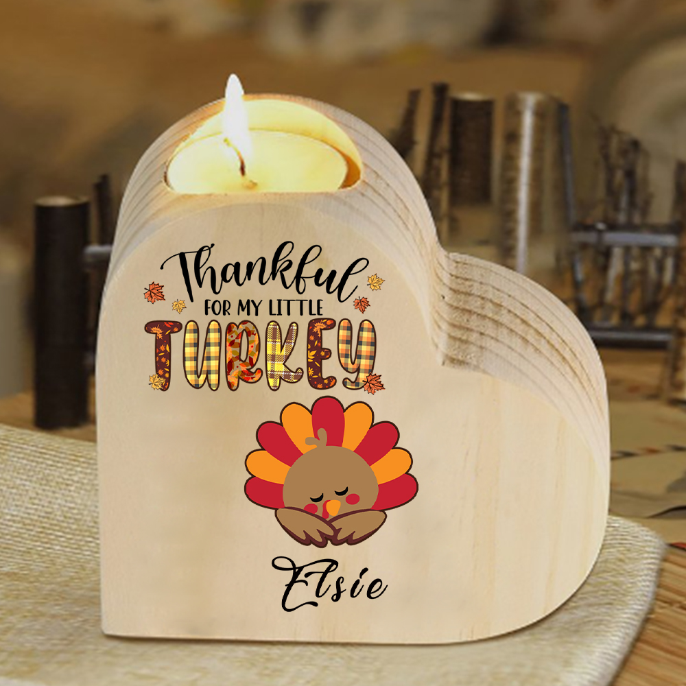 1 Name - Thanksgiving Wooden Candle Holder Customized Name Candlestick "Thankful For My Little Turkey" Thanksgiving Gift for Family