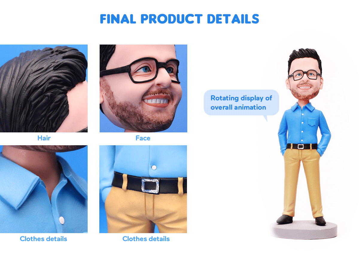 • We use polymer clay that meets the highest industry standards, it's a non-toxic, multi-color, and environmentally friendly convertible material that makes your bobblehead very alive-looking.