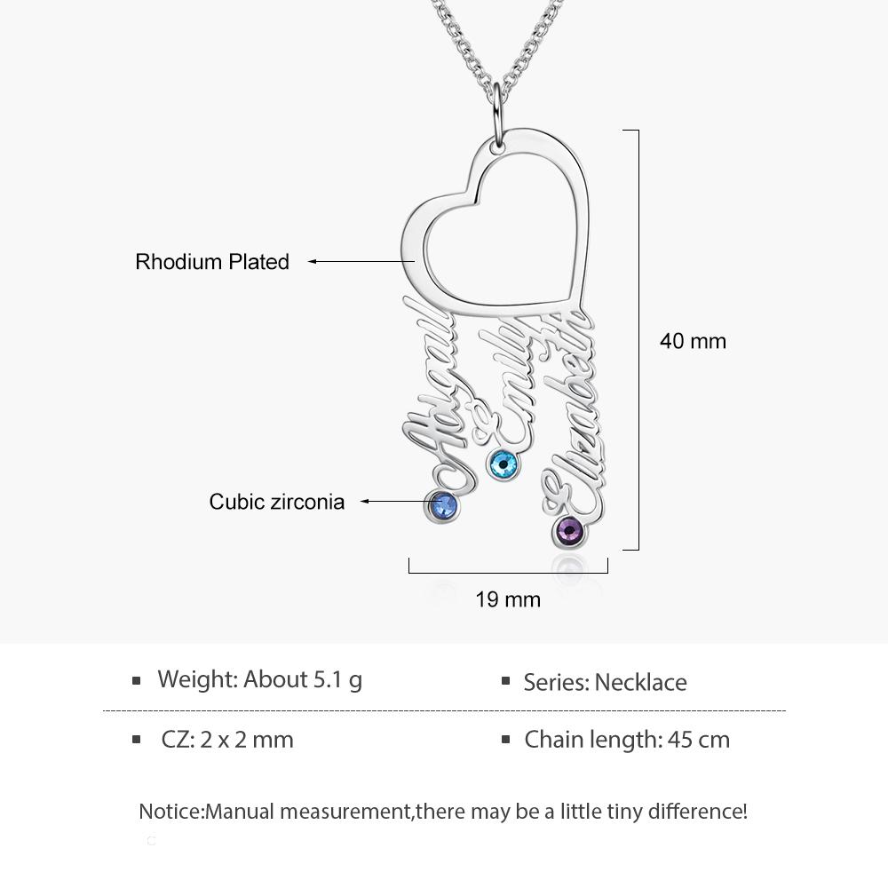 Heart-shaped Custom Name Necklace Engraving 3 Names and 3 Birthstones