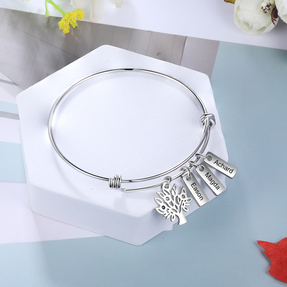 Family Tree Bangle Personalized 6 Birthstones and Names Bracelet for Her