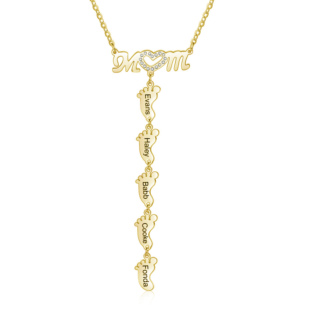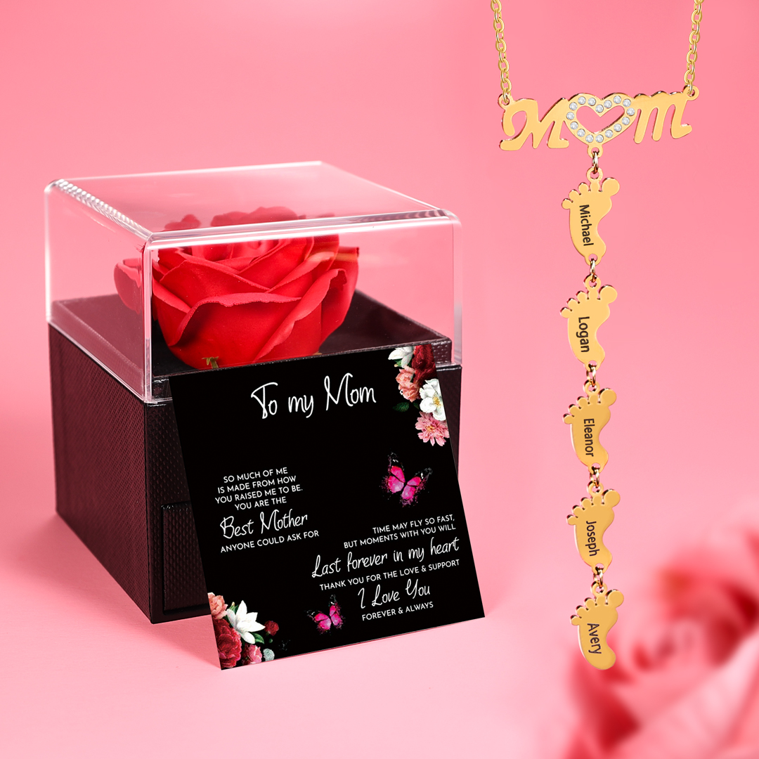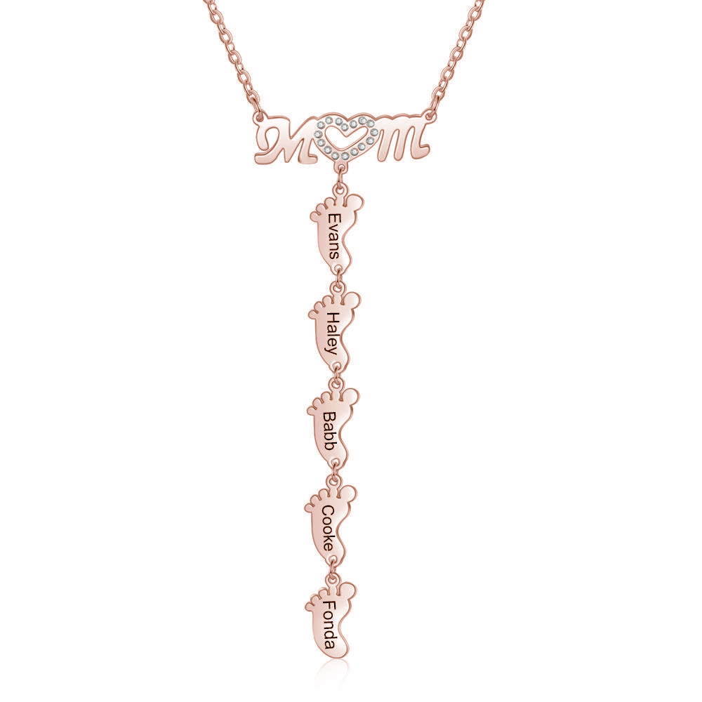 Mother Necklace with 5 Baby Feet Pendants Engraved 5 Names Rose Gift Set