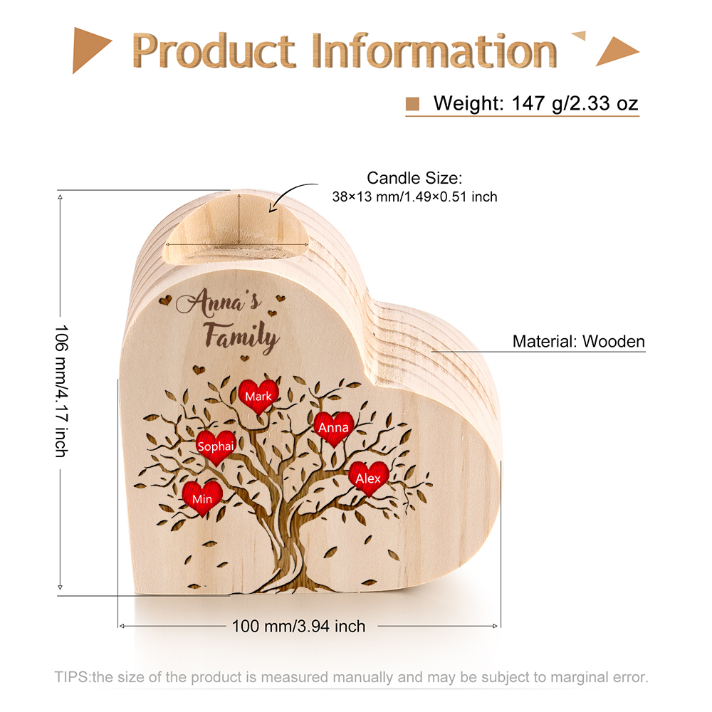 To My Family Wooden Heart Candle Holder Custom 5 Names Family Tree Candlesticks