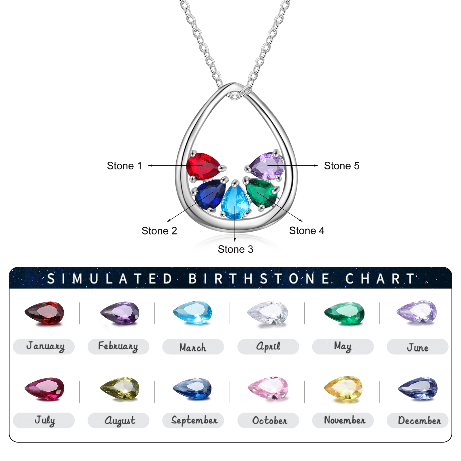Personalized Teardrop Necklace with 5 Birthstones Family Necklace