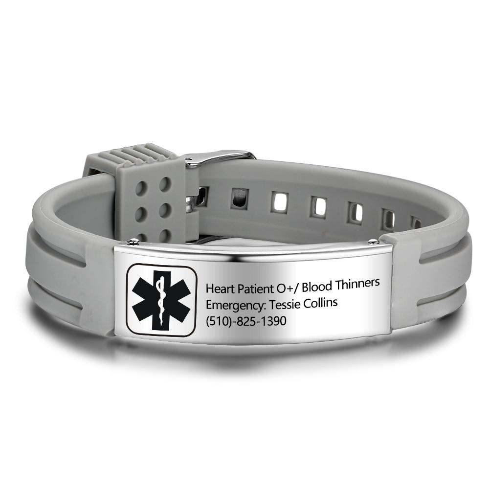 Medical Alert Bracelet Women Men Adjustable Sport Bracelet Waterproof Silicone Engraved Personalized Emergency ID Wristband Grey