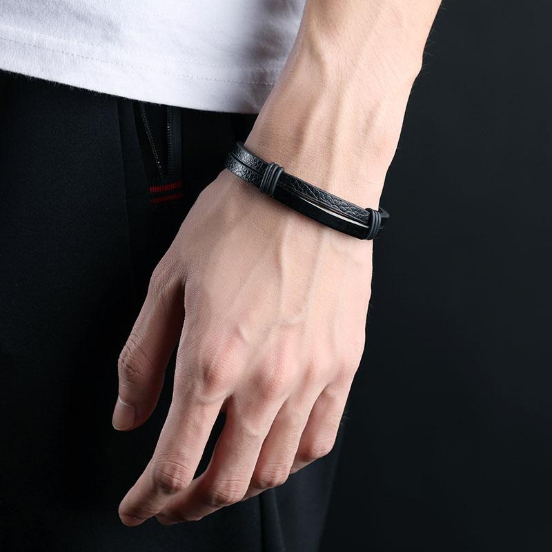 Mens Leather Bracelet Black Engraved Personalized Bracelet Stainless Steel in Gold