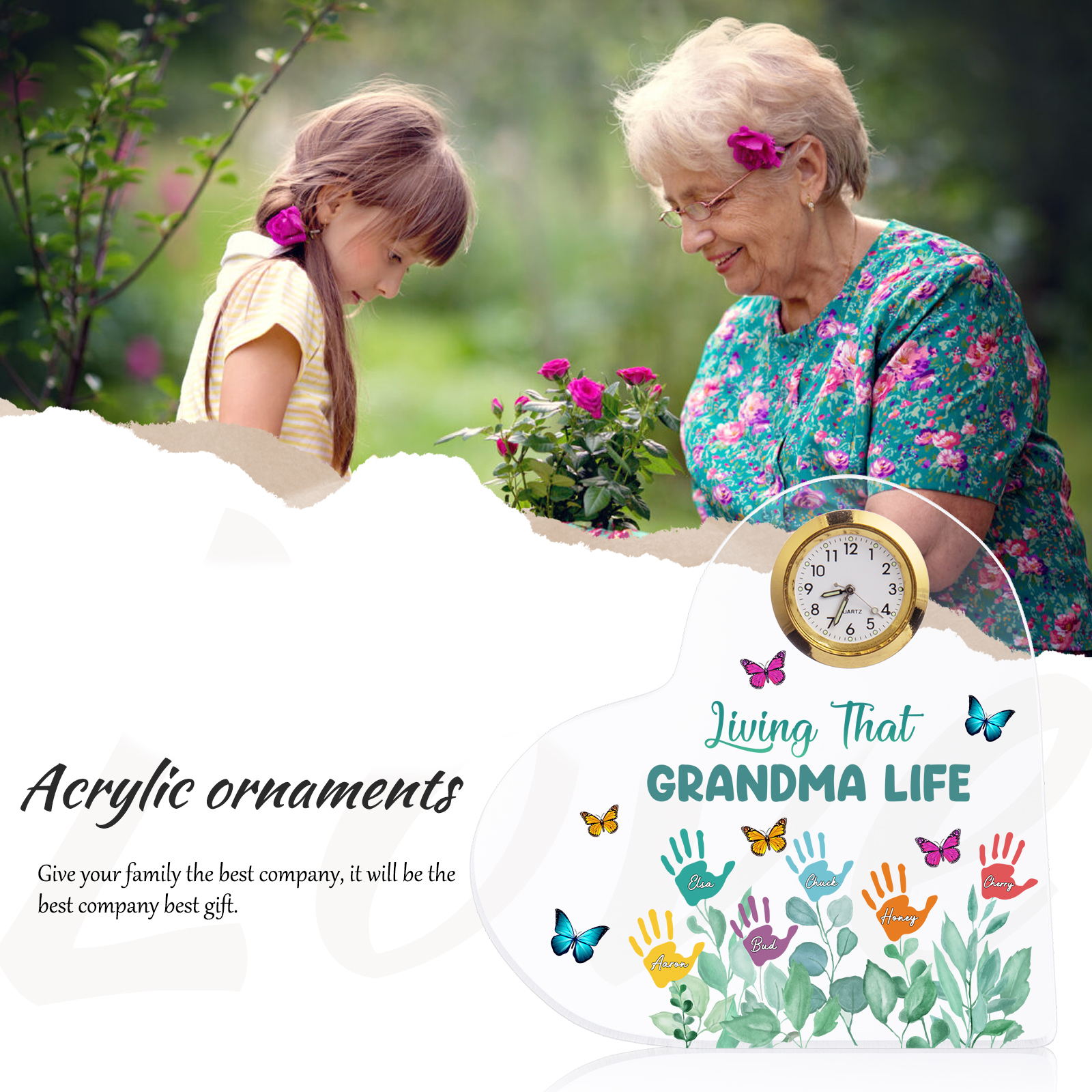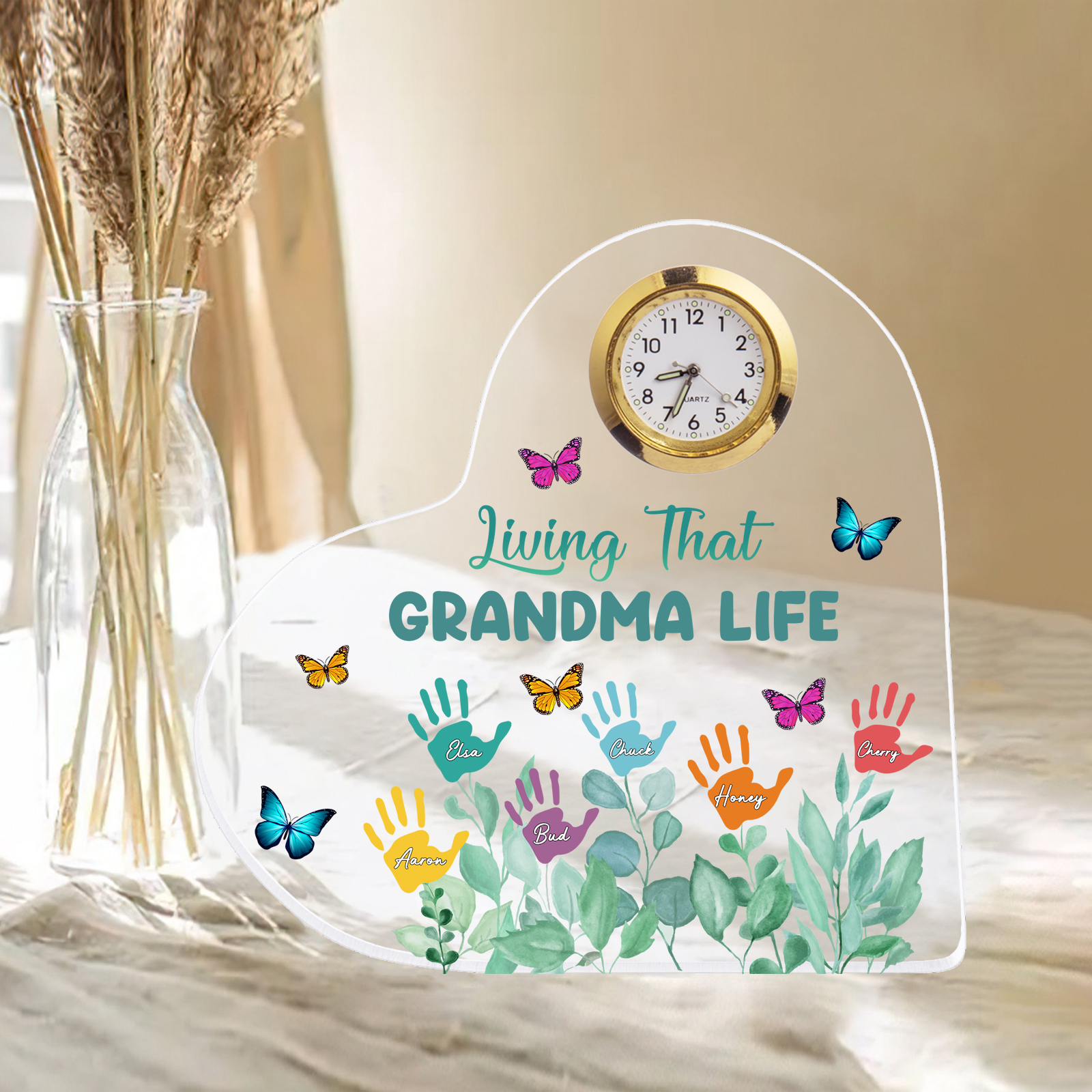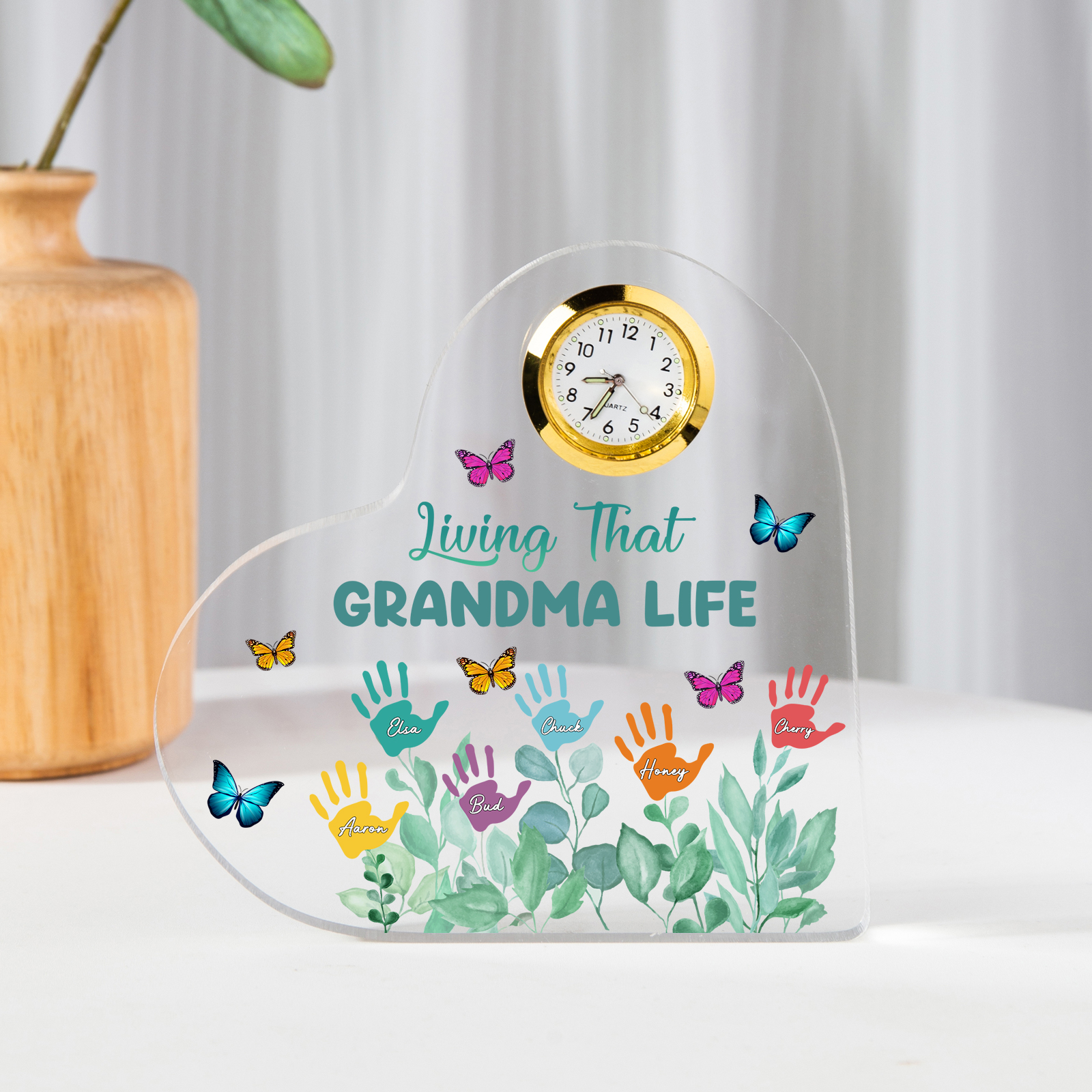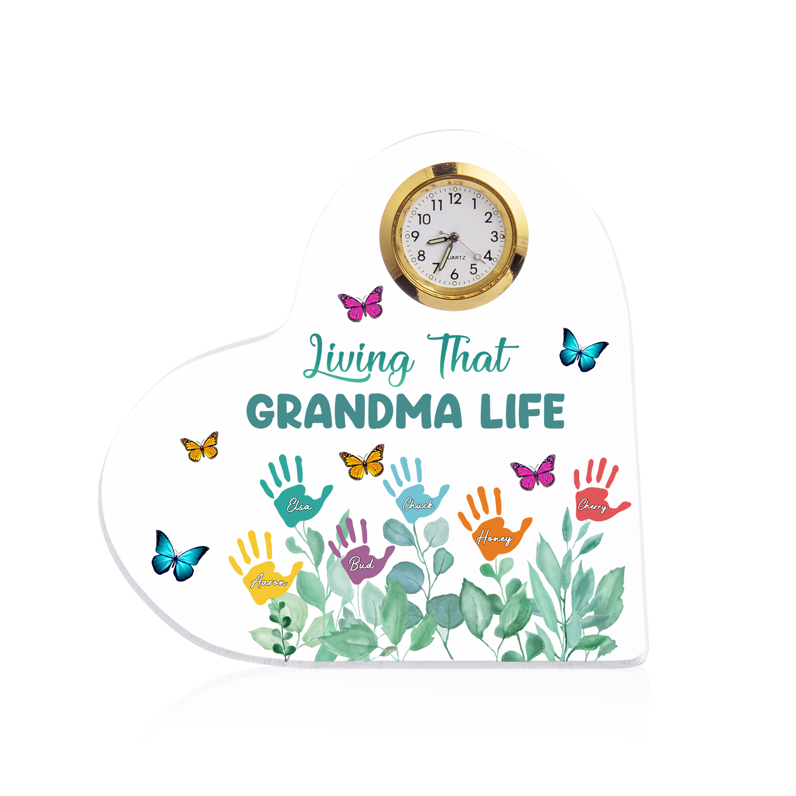 Personalized Heart-Shaped Acrylic Clock Keepsake Engraved 6 Names Heart Butterfly Ornament Grandparents' Day Gift for Mom Grandma