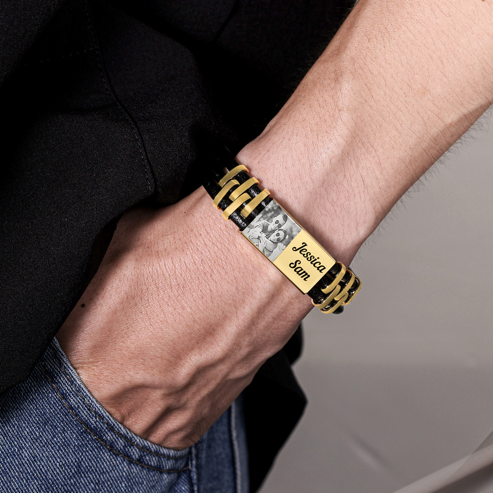 Personalized Photo Bracelet in Gold ID Bar Leather Bracelet Father's Day Gift