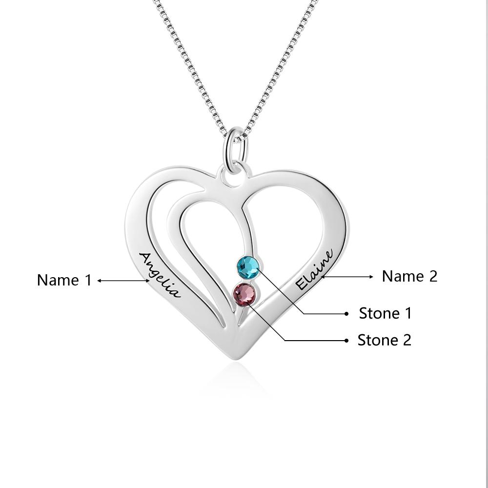 Double Heart Birthstone Necklace Engraved 2 Names Personalized with 2 Stone Love Pendant Necklace
