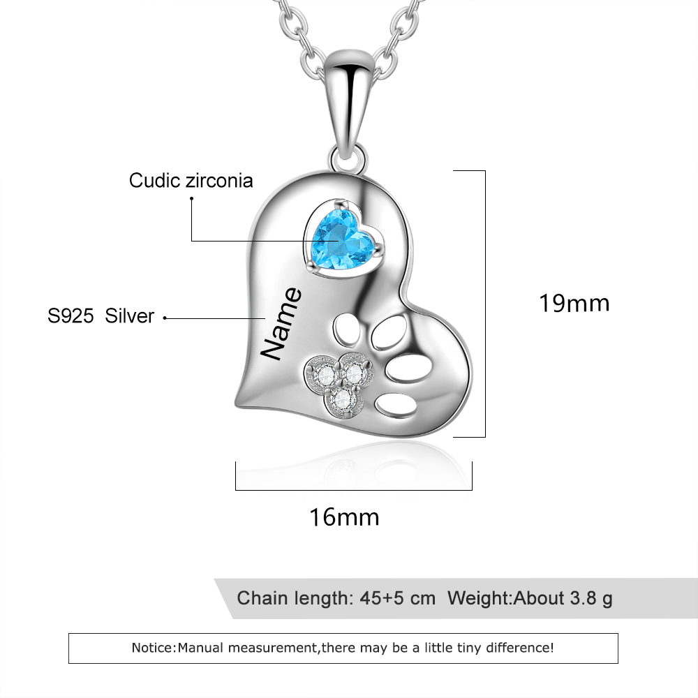 Personalized Heart Paw Print Necklace with Birthstone Sterling Silver Pet Necklace
