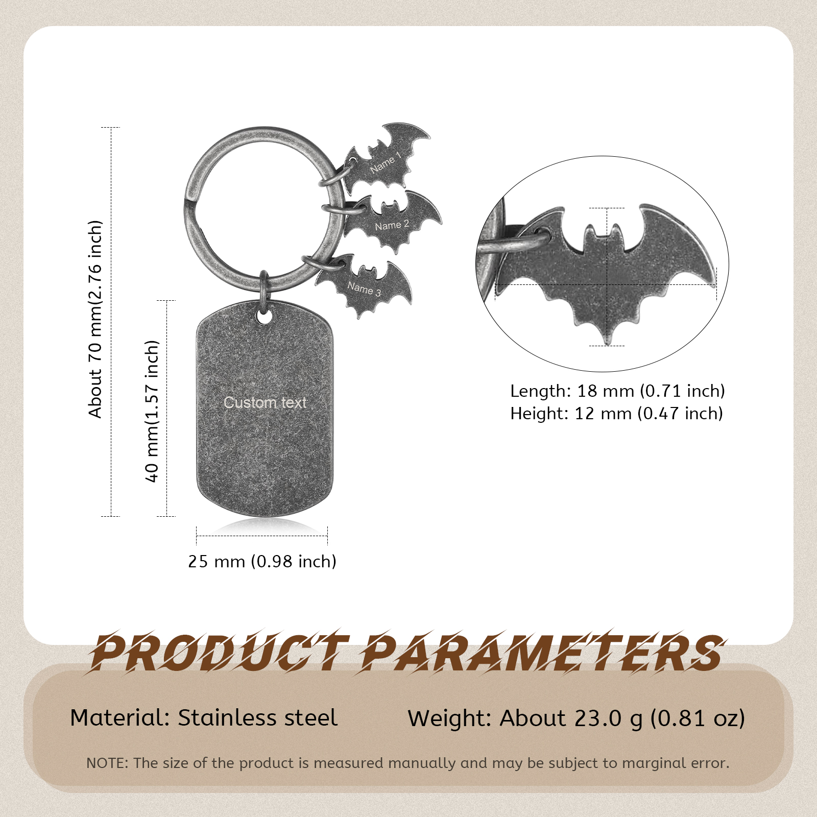 🦇 This kind of men's vintage bat keychain is a unique accessory that adds a distinctive style to your keys or bags. You can customize the keychain with text and multiple names, making it a personalized item.