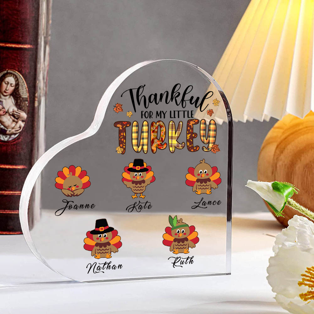 5 Names - Thanksgiving Acrylic Heart Keepsake Customized Name Ornament "Thankful For My Little Turkey" Gift for Family