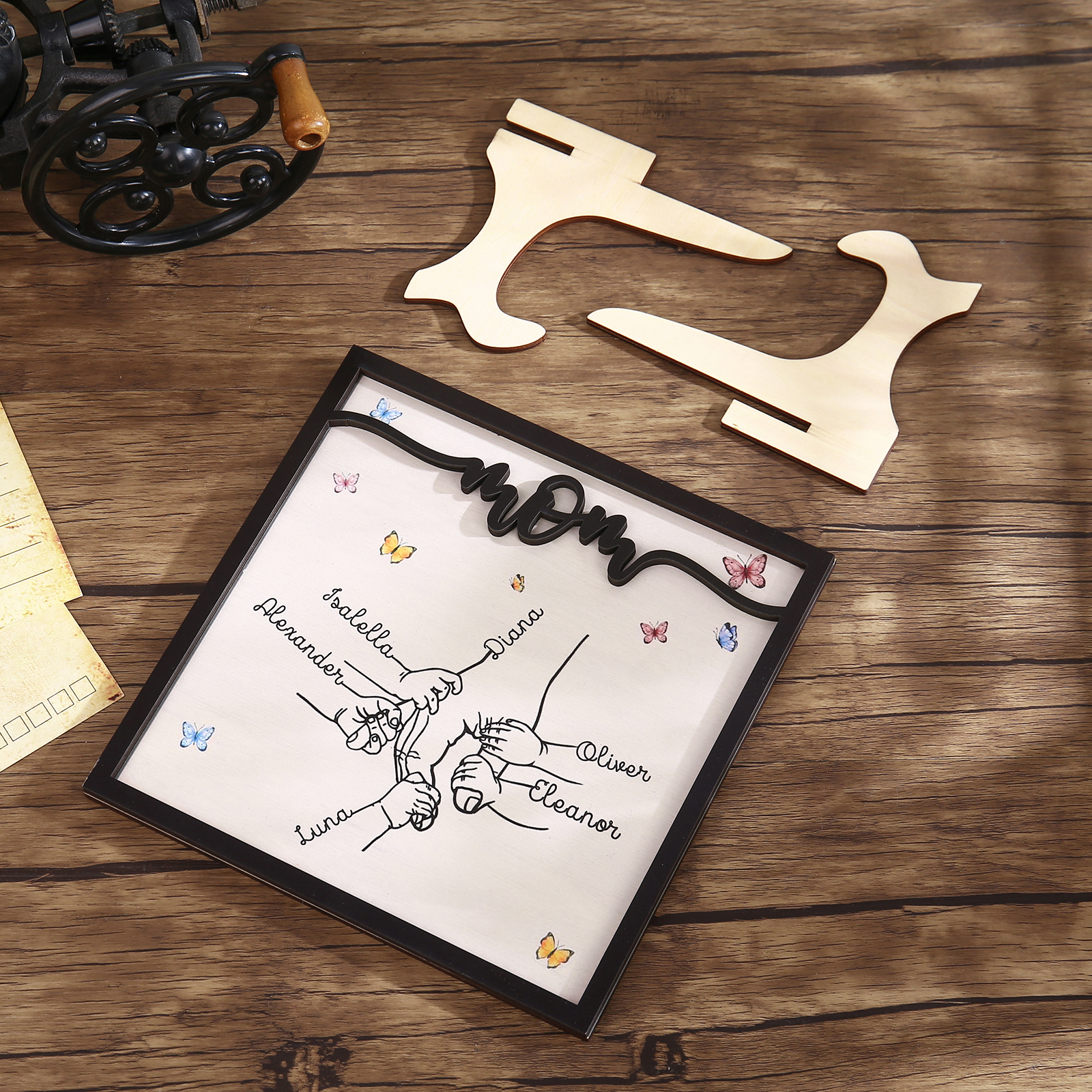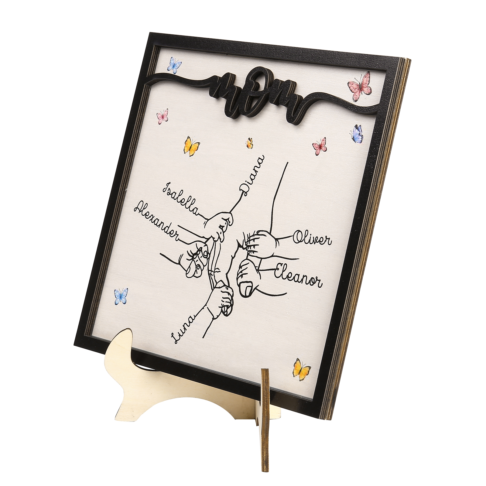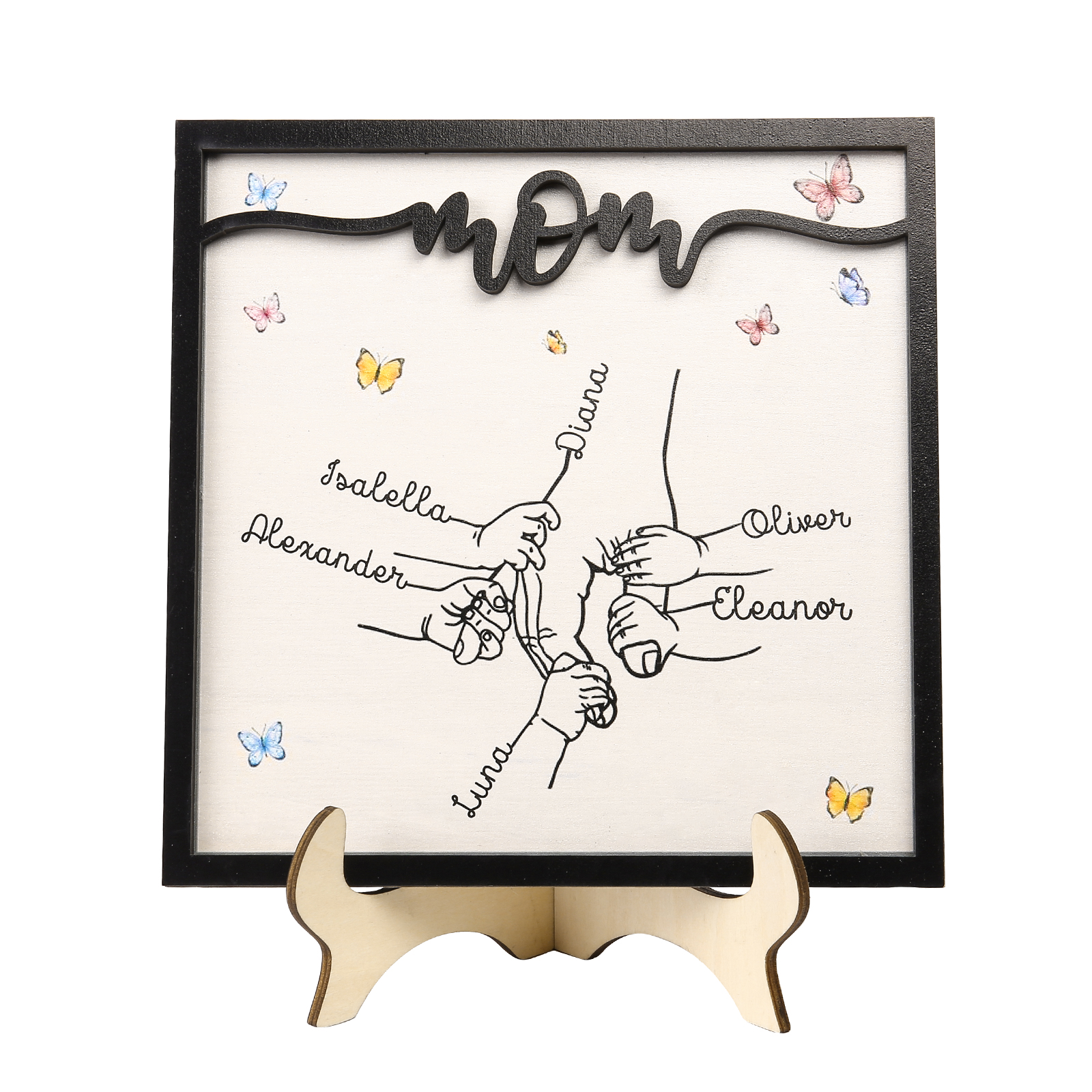 6 Names - Personalized Wooden Plaque Holding Mom's Hand Desktop Decorations Wooden Sign With Stand