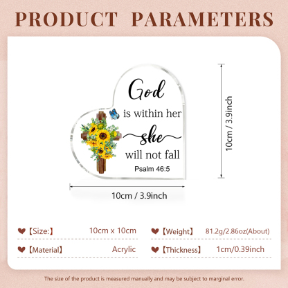 🎉 The Acrylic Heart Keepsake blends the elements of the cross and sunflower, along with the scripture "God is within her, she will not fall" (Psalm 46:5). Each element represents faith, and each word is a divine promise, reminding you that God resides within you, and you shall not fall.