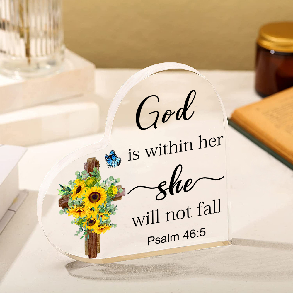 • This acrylic heart keepsake with a cross and sunflower, along with Psalm 46:5, is perfect for those seeking the strength of faith and divine protection.