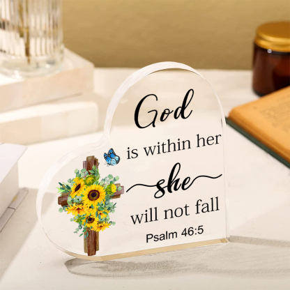 Acrylic Heart Keepsake Cross Sunflower Plaque - God is within her, she will not fall - Motivational Gift for Her