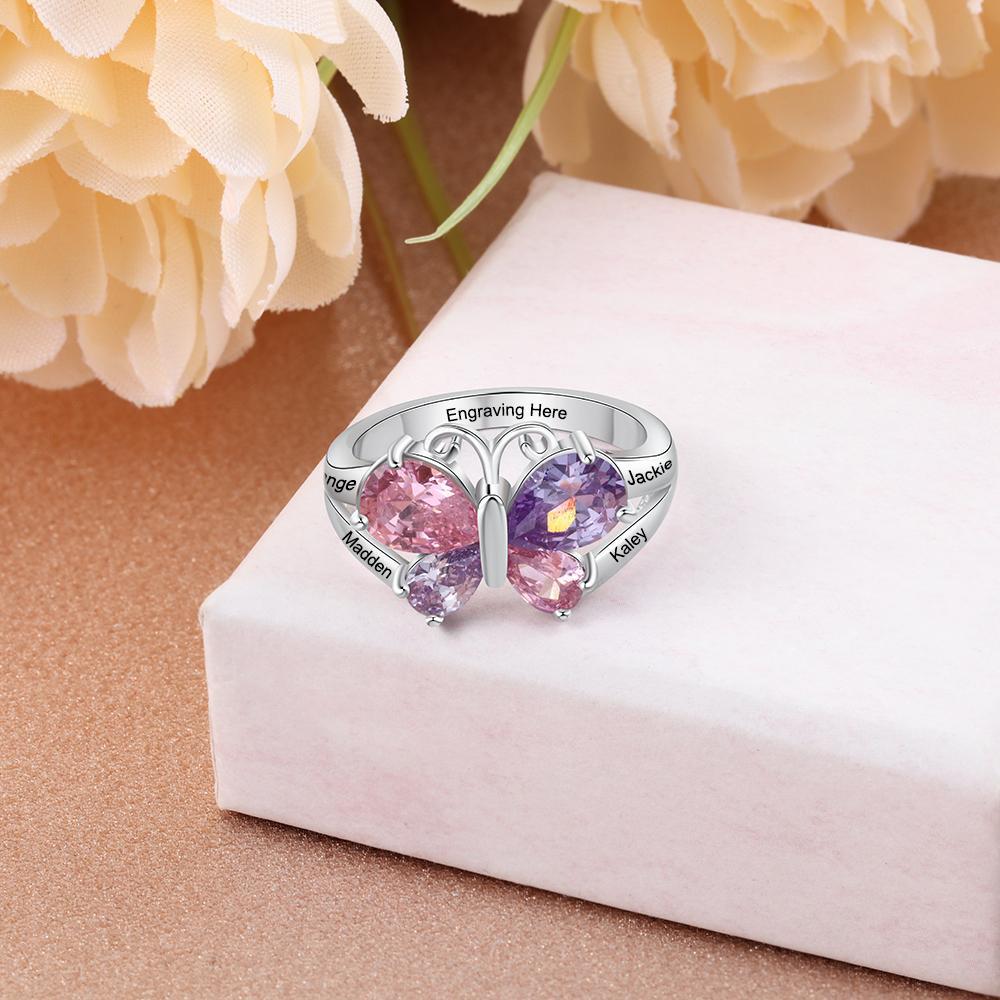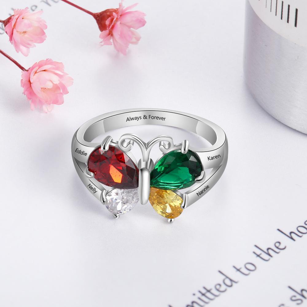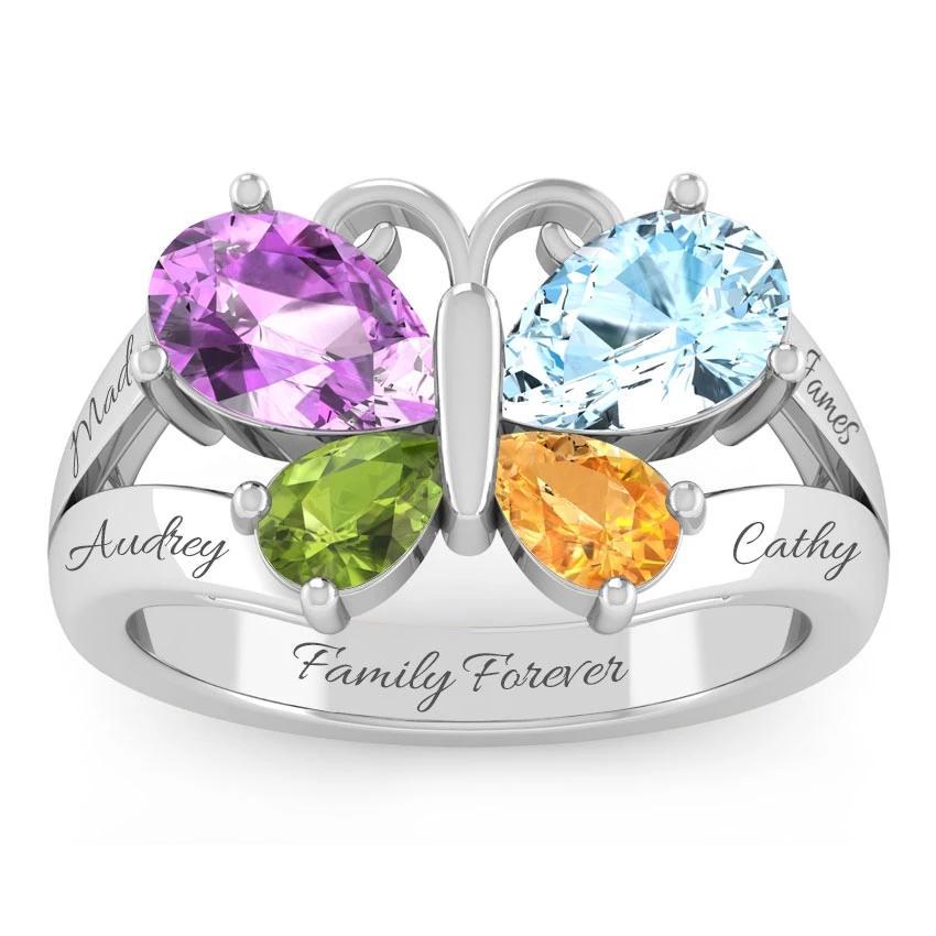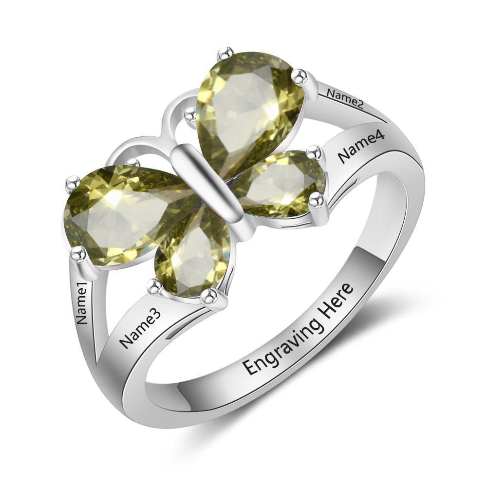 August Birthday Gift Birthstone Butterfly Mother Ring 4 Stones Engraved 4 Names