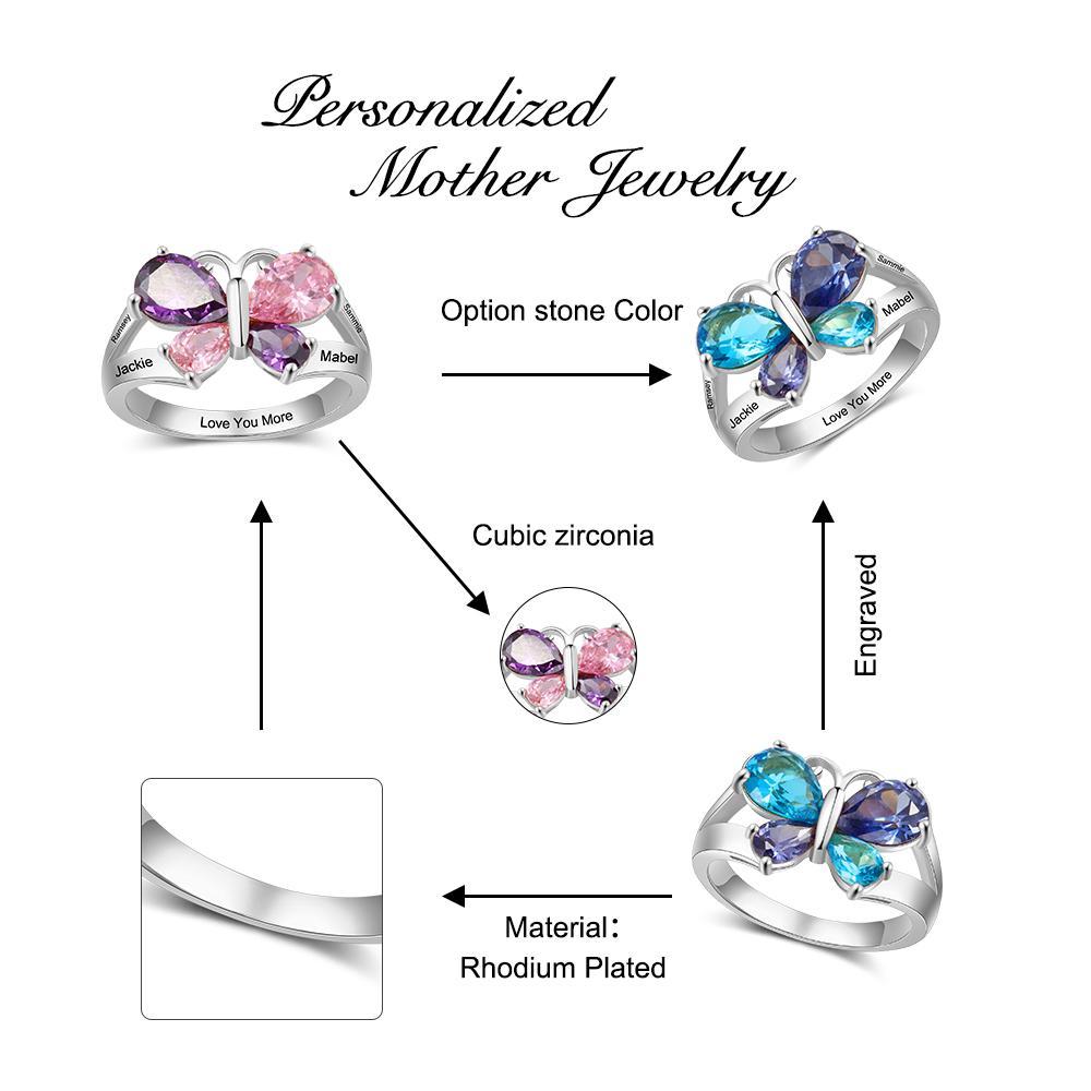 More: Personalized ring with drop birthstones, Custom ring with childrens names, Perfect gift for mother, Percious butterfly shape, Evolve
