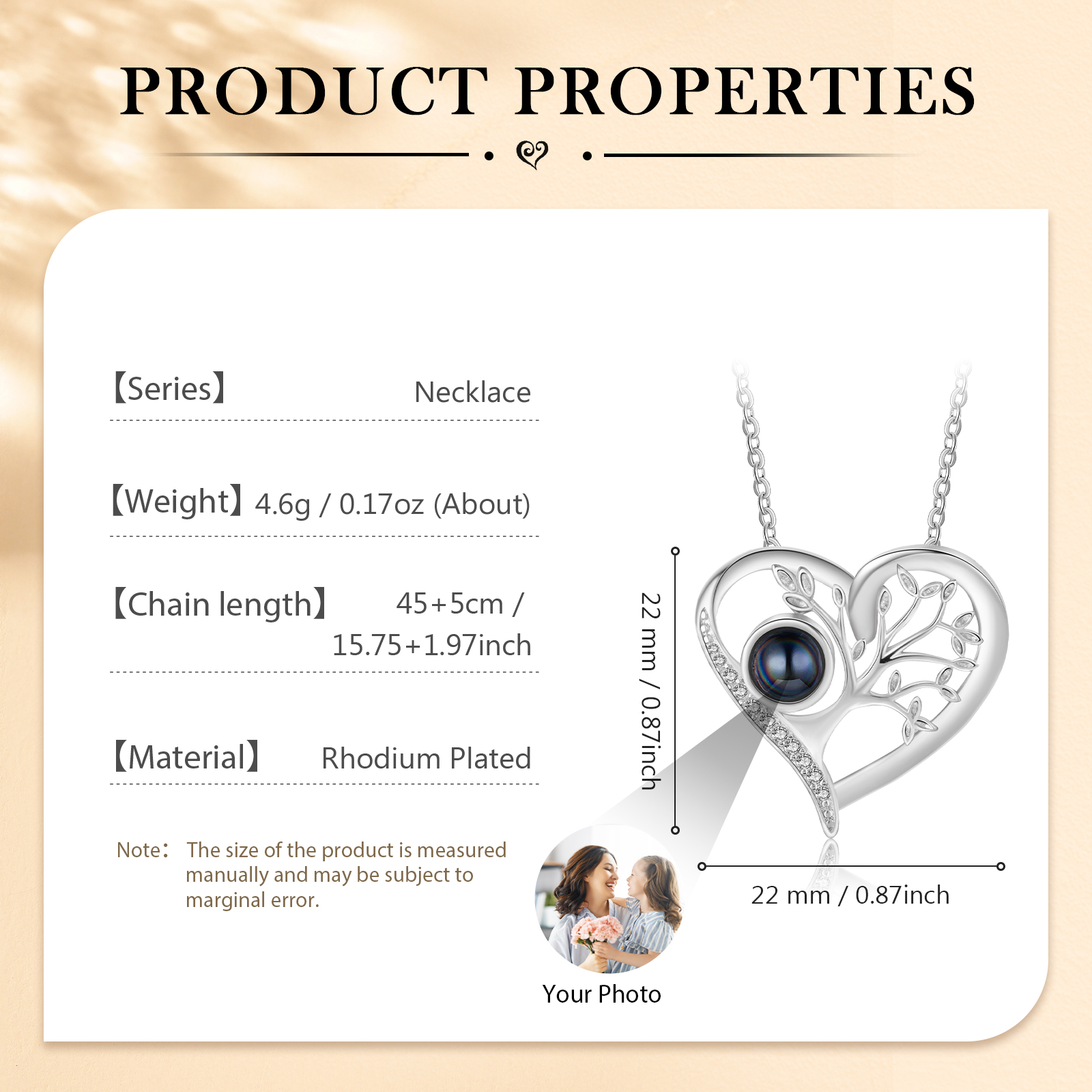 • A Picture Inside – Each necklace has a custom picture inside. You can upload any picture which you favorite. The clearer the uploaded photo, the better the effect. Look inside or use your phone's camera to reveal the picture.