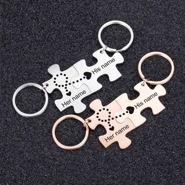 This Couple Puzzle Keychain Set engraved with your message is a gift idea for your loved one. It conveys the love of the heart to each other. One piece is not complete without the other!