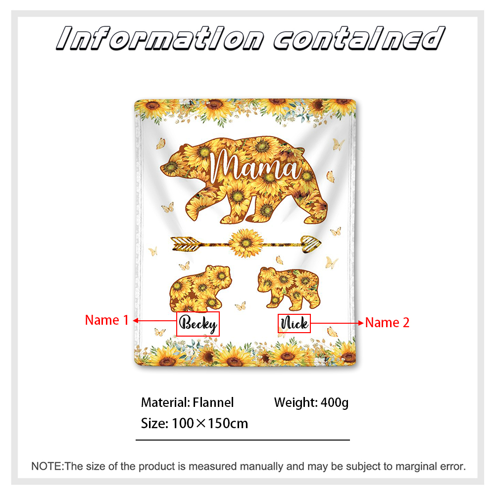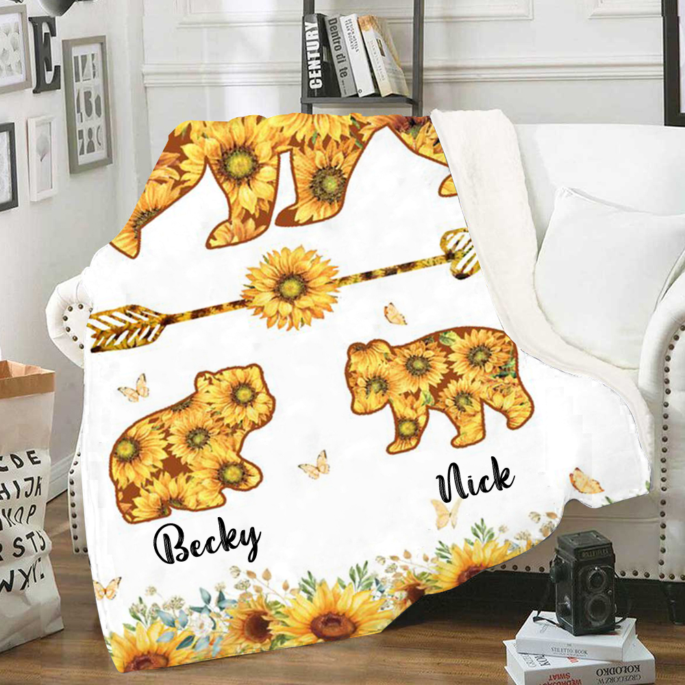 Personalized 2 Names Blanket Sunflowers Bears Family Blanket Mother's Day Gift for Mama