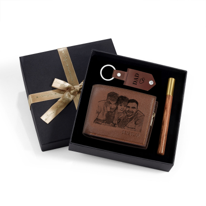 Personalized 2 Photos & 1 Text Gift Set Custom Wallet & Keychain & Pen Gift Box Set Father’s Day Gift for Him